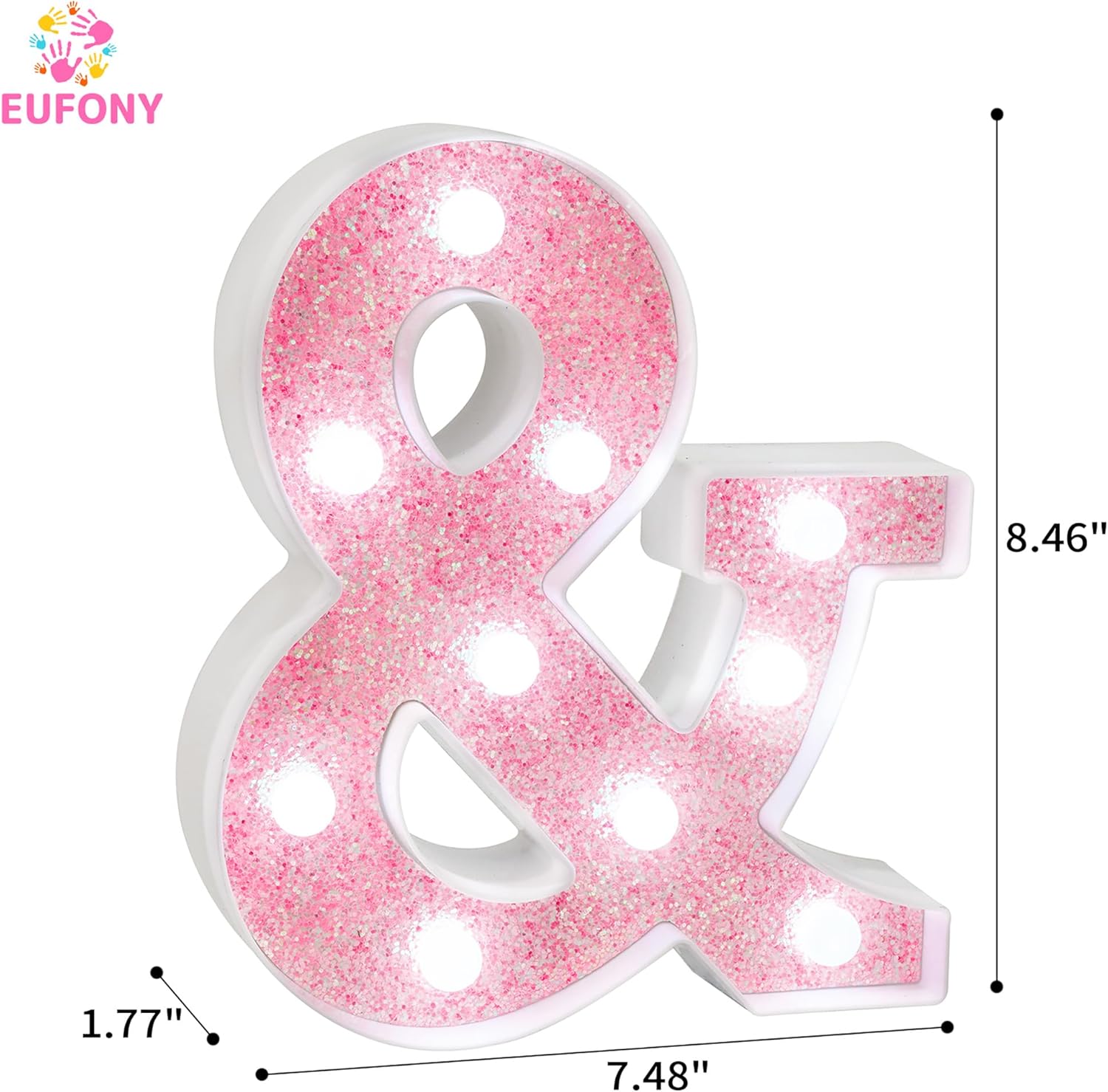 Our pink glitter marquee ampersand light with cool white LED lighting, battery powered design, and lightweight decorative build is a stylish and versatile addition to party table decorations, wall decor, and girls’ room styling, delivering a clean and vibrant glow ideal for birthdays, weddings, baby showers, and special celebrations while offering flexible placement on tabletops or walls with easy operation.