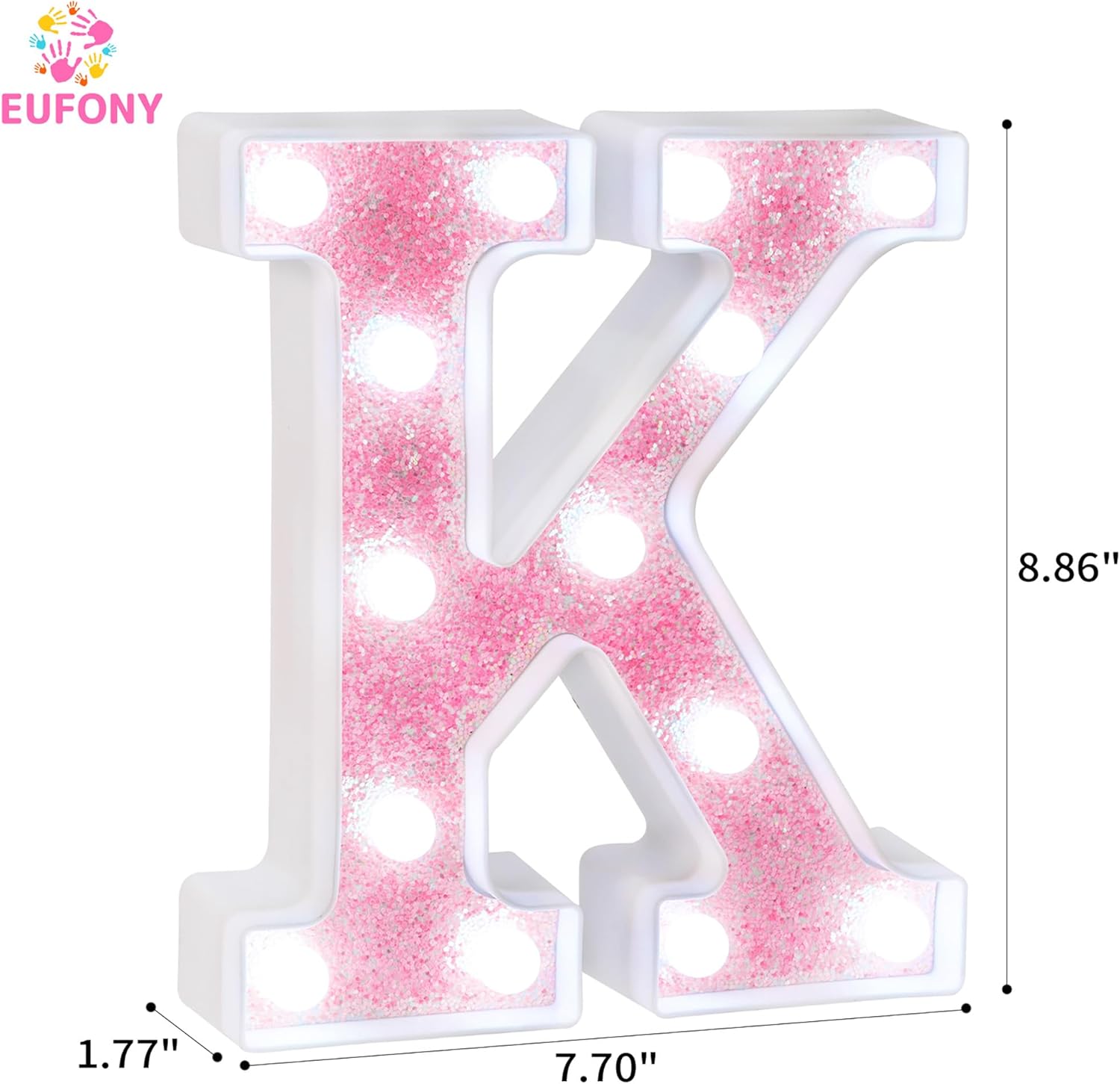 Our Pink Glitter LED Marquee Letter K features cool white LED lighting, compact lightweight design, and battery-powered operation, making it perfect for birthday party table decorations, wall decor for girls' bedrooms, and personalized celebrations. This stylish letter can be displayed on tables or hung on walls, adding a bright and elegant touch to birthdays, weddings, baby showers, gender reveals, and holiday events such as Christmas, Valentine’s Day, and Mother’s Day.