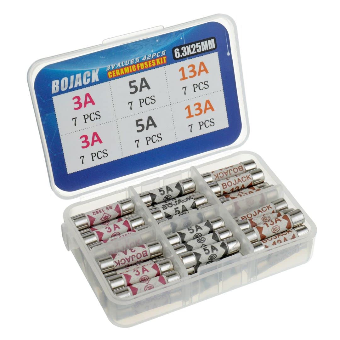 Our 42PCS ceramic tube cartridge fuses assortment kit with 3A, 5A and 13A ratings, 240V voltage capacity, 6.3x25mm (0.25x1 inch) size and clear plastic storage box provides a reliable solution for protecting household mains plugs and electrical circuits. Manufactured from high-quality ceramic material, these BS1362-style fuses are designed for consistent performance and dependable circuit protection. The assortment includes three common amperage ratings to suit various domestic applications, ensuring convenient replacement when needed. Supplied in a durable plastic storage case, this organised kit is ideal for home maintenance, electricians and general electrical repairs.
