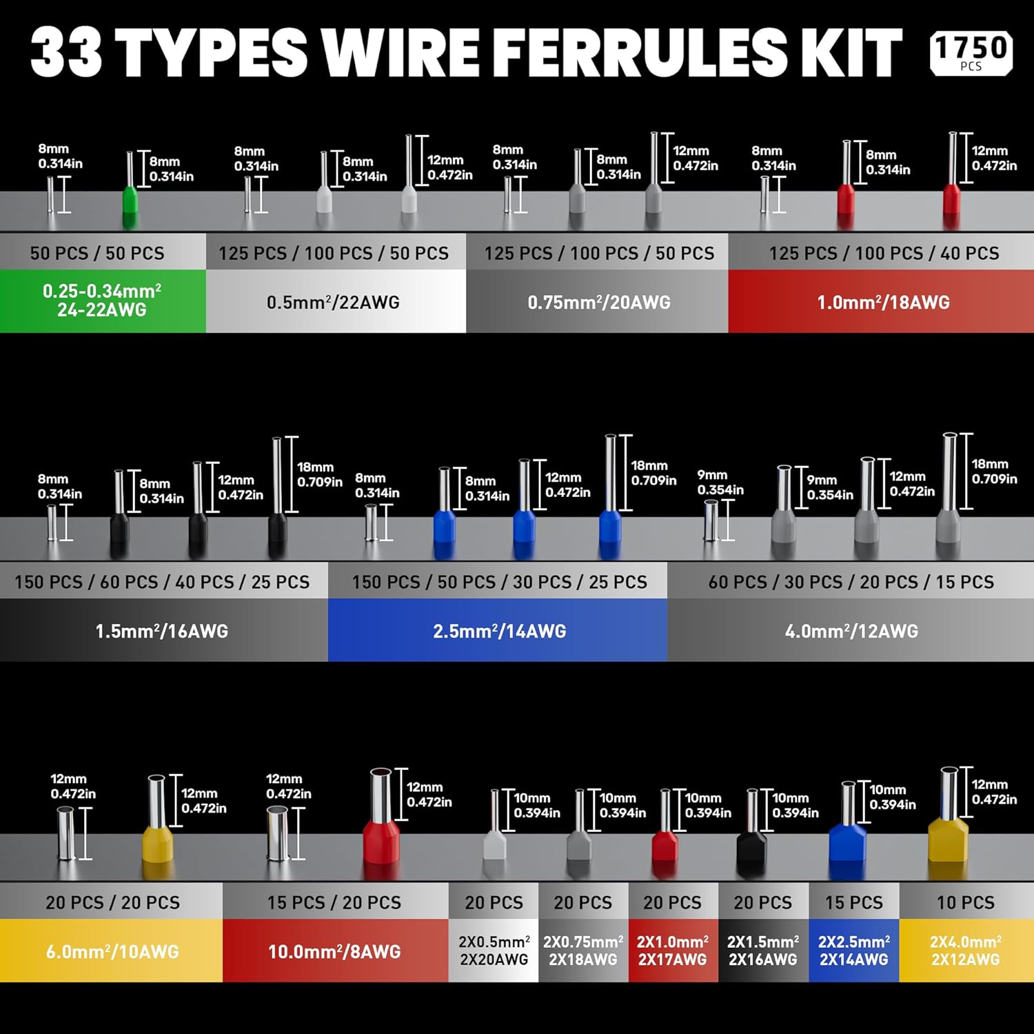 - 33 sizes insulated and uninsulated ferrules