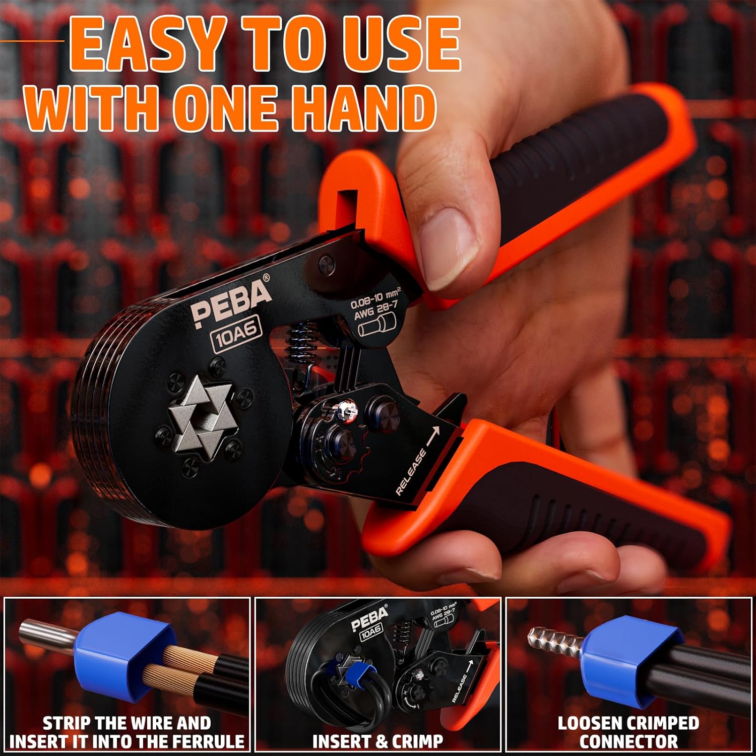 - Self-adjusting ratchet crimping tool for AWG 28–7 wires