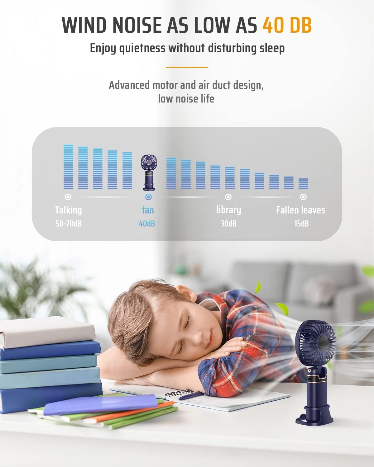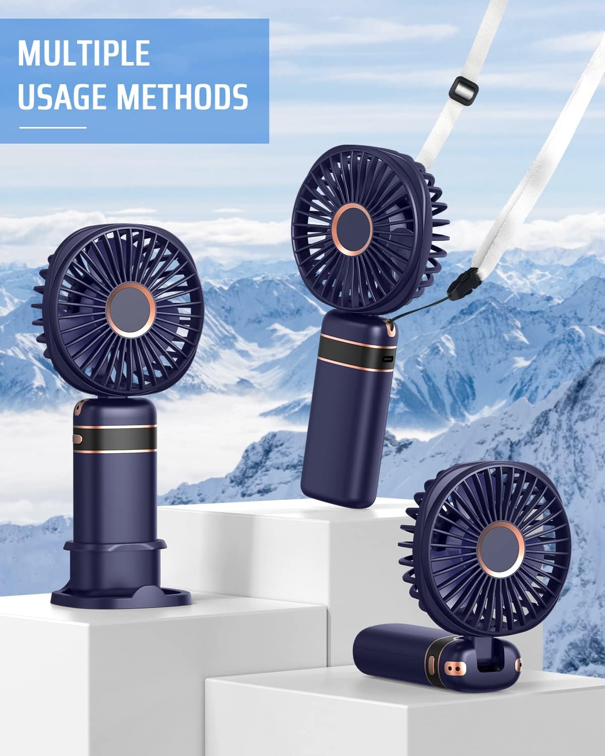 Our mini handheld USB fan offers portable cooling with 5 adjustable speeds, a 4000mAh rechargeable battery, and a versatile folding design that allows handheld use, tabletop placement, or neck hanging for home, office, or outdoor travel. This ultra-quiet fan features a simulated natural circulation wind mode, long-lasting battery life of 5–20 hours depending on speed, and an LED display for easy monitoring of power and usage time.