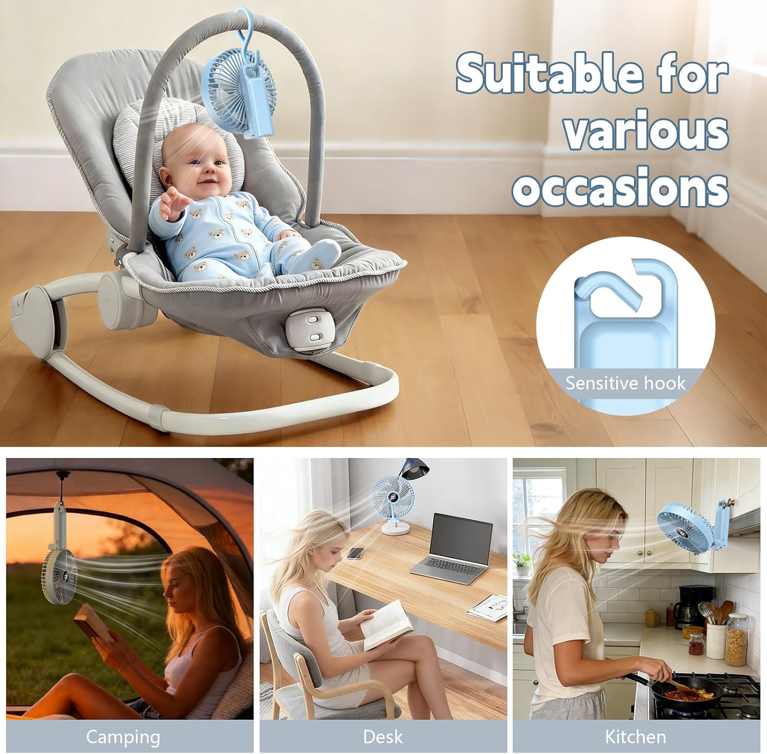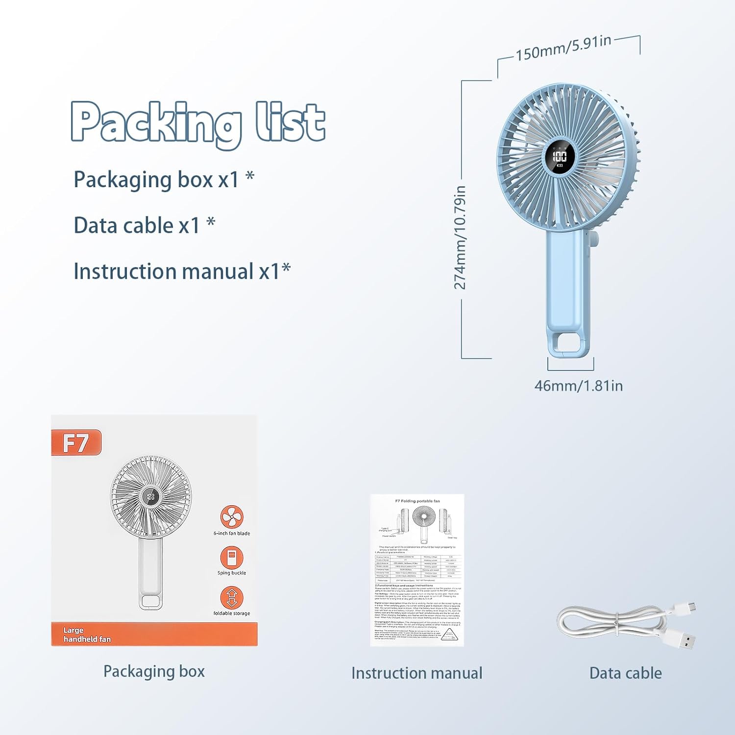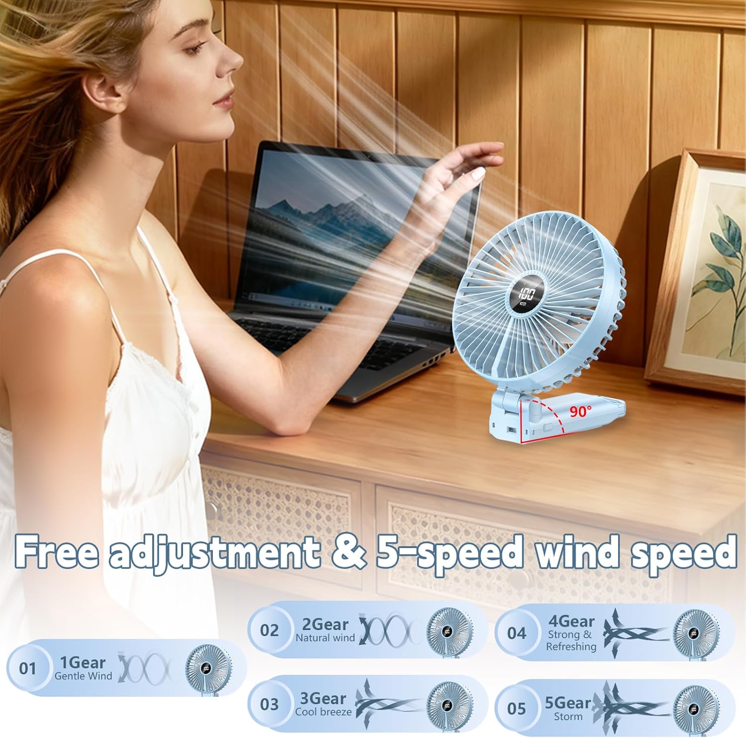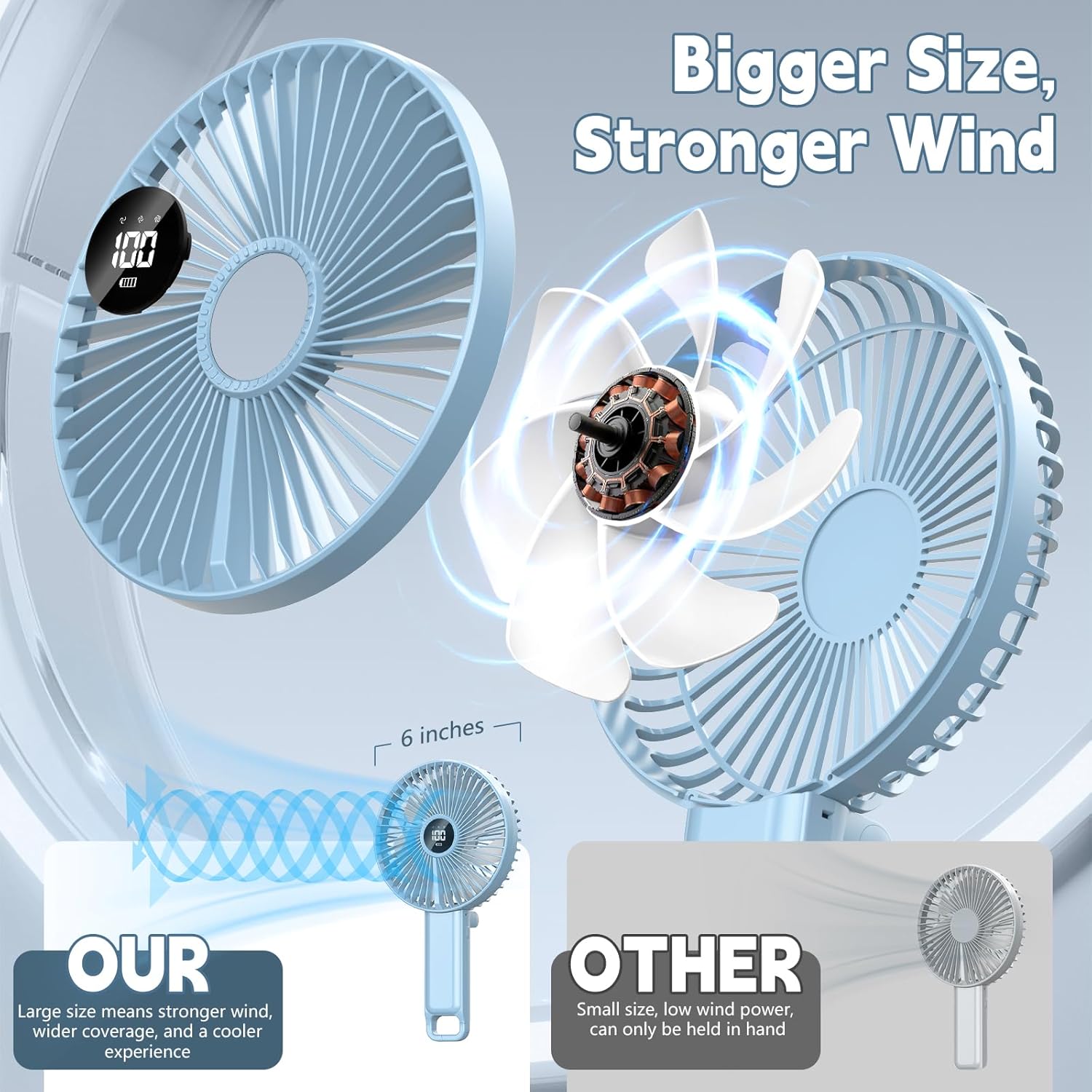 Our portable 6-inch handheld fan features high airflow, 5 adjustable speeds, a 3600mAh rechargeable battery, 180° foldable design, and a digital display, making it ideal for handheld, desktop, or hanging use at home, office, travel, or outdoor activities. This versatile fan delivers 2.5–8.5 hours of cooling depending on speed, with a smooth finish, quick 3-hour full recharge, and intuitive single-button operation. Its multi-function design allows it to stand, hang, or be held comfortably, providing reliable and efficient cooling wherever needed.