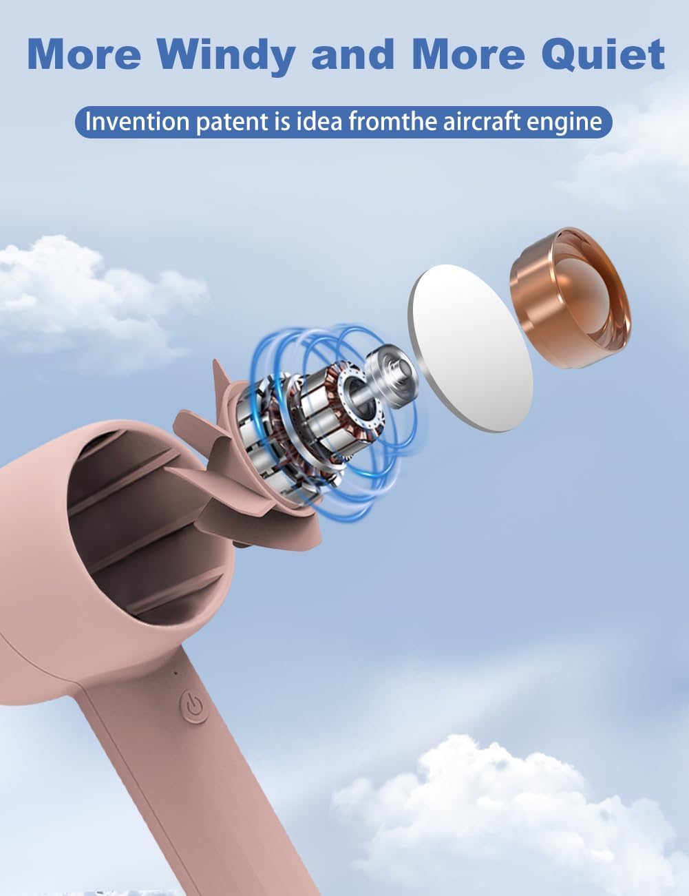 Rechargeable handheld fan with aromatherapy function, 3-speed adjustable airflow, 2000mAh battery, portable travel design, and ergonomic desk base delivers efficient personal cooling for commuting, makeup application, outdoor use, and daily indoor comfort. Engineered with an aviation-grade turbine air guide system and magnetic levitation motor, this compact fan enhances airflow performance while maintaining a lightweight and travel-friendly form. The integrated aromatherapy feature allows scent infusion for a relaxing cooling experience, and the included desk base adds versatile hands-free operation for personal workspaces.