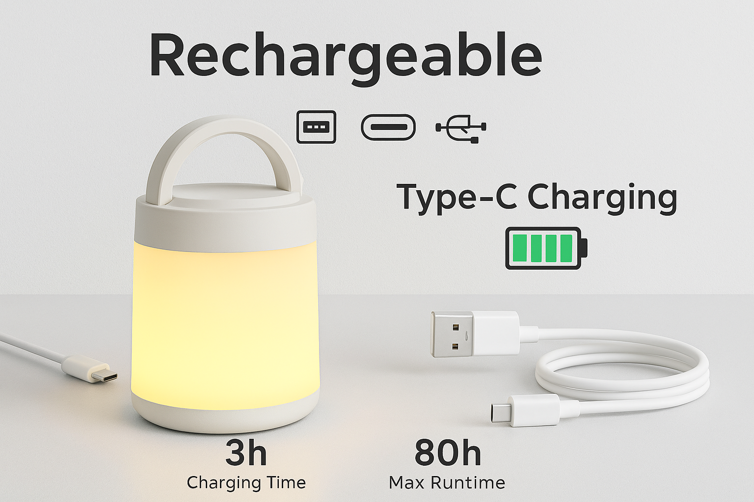 Built-in rechargeable battery provides up to 15 hours of light—no cables or outlets needed.