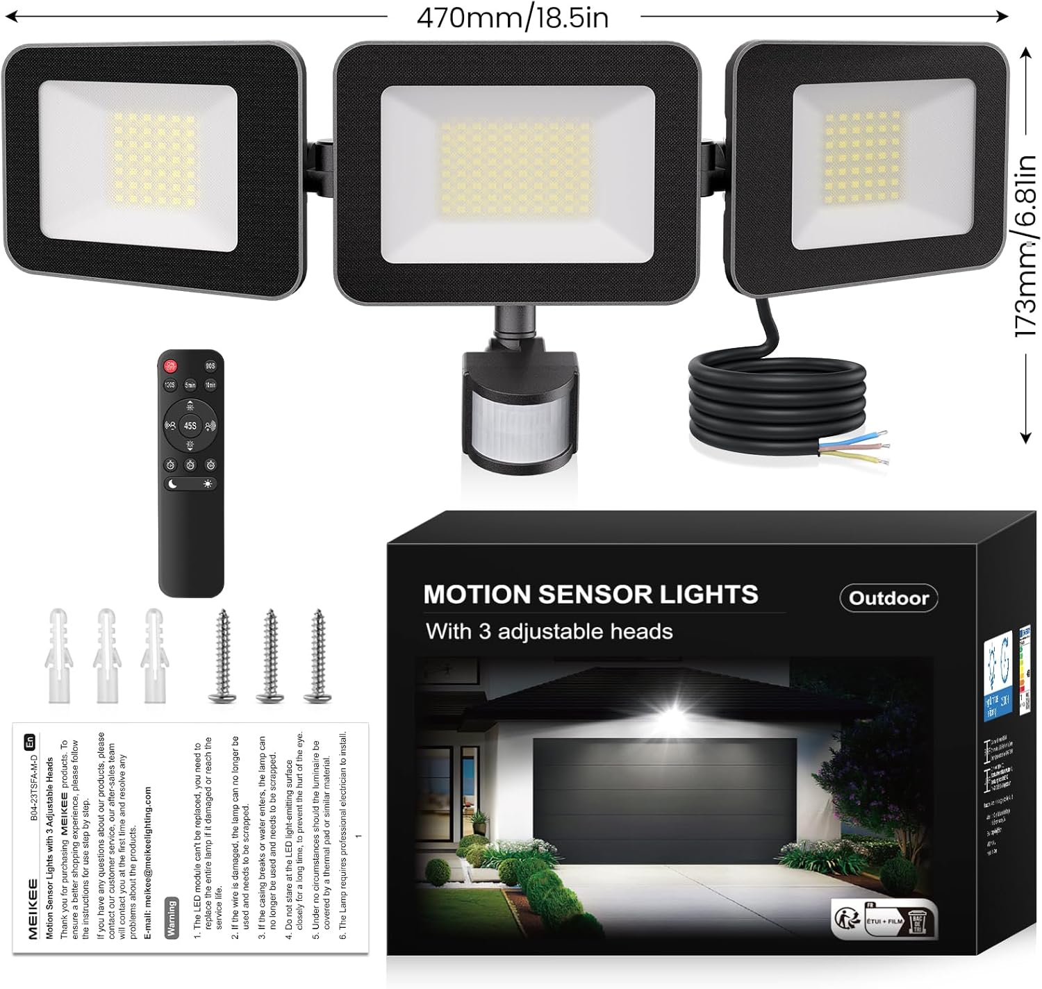 Enhance your home and garden security with the 100W PIR LED Security Light, engineered for maximum brightness, durability, and energy efficiency. Featuring 3 adjustable lamp heads, this floodlight provides a wide 270° beam angle and 9600LM output, illuminating driveways, garages, terraces, and courtyards with ease. The PIR motion sensor detects movement up to 12m, automatically switching on the light to deter intruders and ensure safety. With customisable settings, you can adjust time (10s–10min), sensing distance, and brightness (10%–100%) to suit your environment.