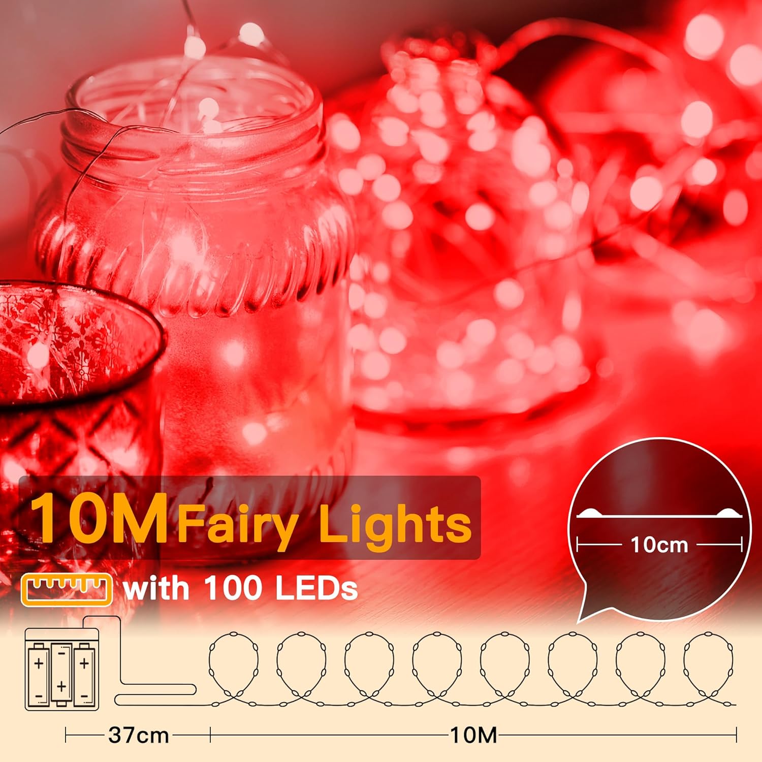 These red battery operated fairy lights are designed to bring a warm and romantic ambience to both indoor and outdoor spaces. Featuring 100 bright red LEDs spread across a 10-metre flexible copper wire, they emit a soft yet eye-catching glow that enhances decorations for Valentine’s Day, weddings, anniversaries, and special celebrations. Battery power allows complete freedom of placement without the need for electrical outlets.