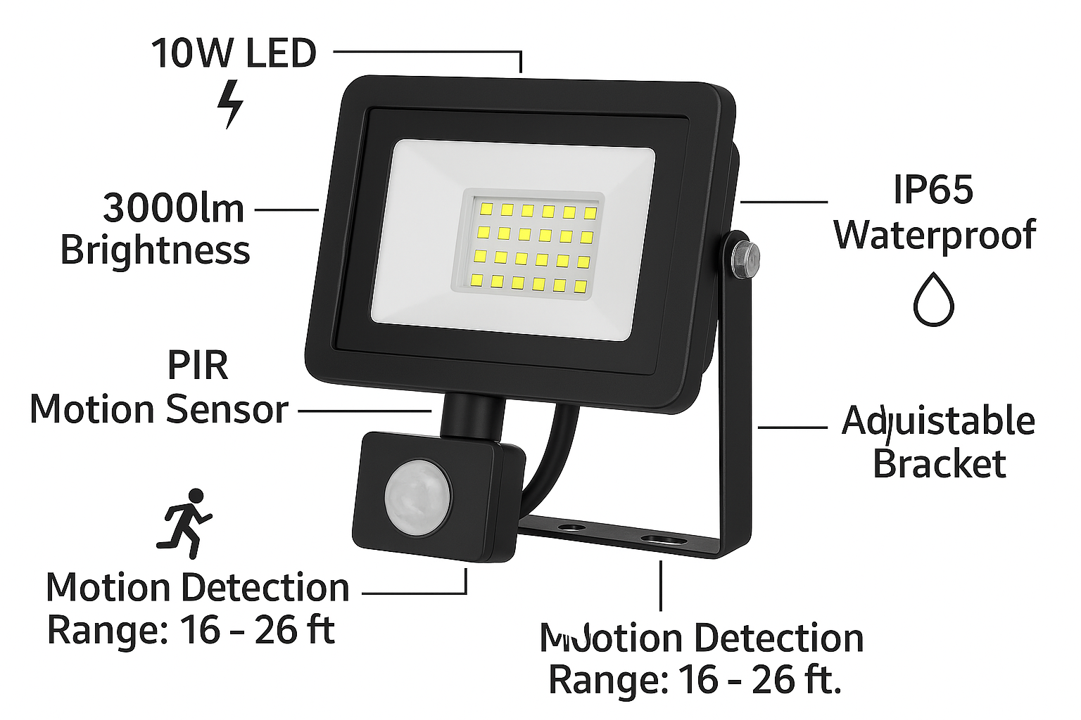 Our 10W Security Lights Outdoor with PIR Motion Sensor offer powerful 3000 lumens of bright, clear light, perfect for illuminating your outdoor spaces. Whether you're looking to enhance the security of your garden, backyard, garage, or entrance, this LED floodlight delivers reliable performance and peace of mind. The PIR motion sensor detects movement up to 12 meters away, ensuring that your lights automatically activate when needed. With an IP66 rating, these lights are designed to withstand harsh weather conditions, providing year-round security for your home.