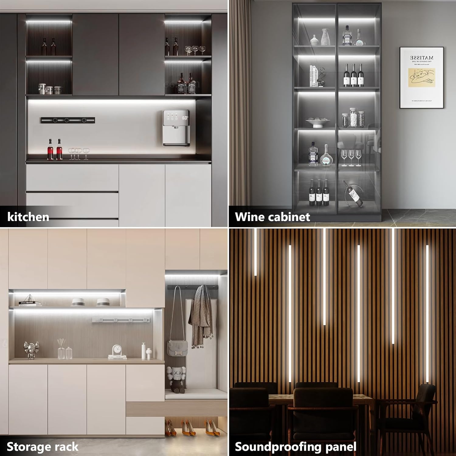 The flexible COB strips are cuttable every 5 cm, making them highly versatile for customised installations in cabinets, cupboards, wardrobes, display cases, and more. The self-adhesive backing ensures secure mounting on smooth, clean surfaces, while the hidden control switch works seamlessly through thin wood or glass, maintaining a clean and minimal aesthetic.
