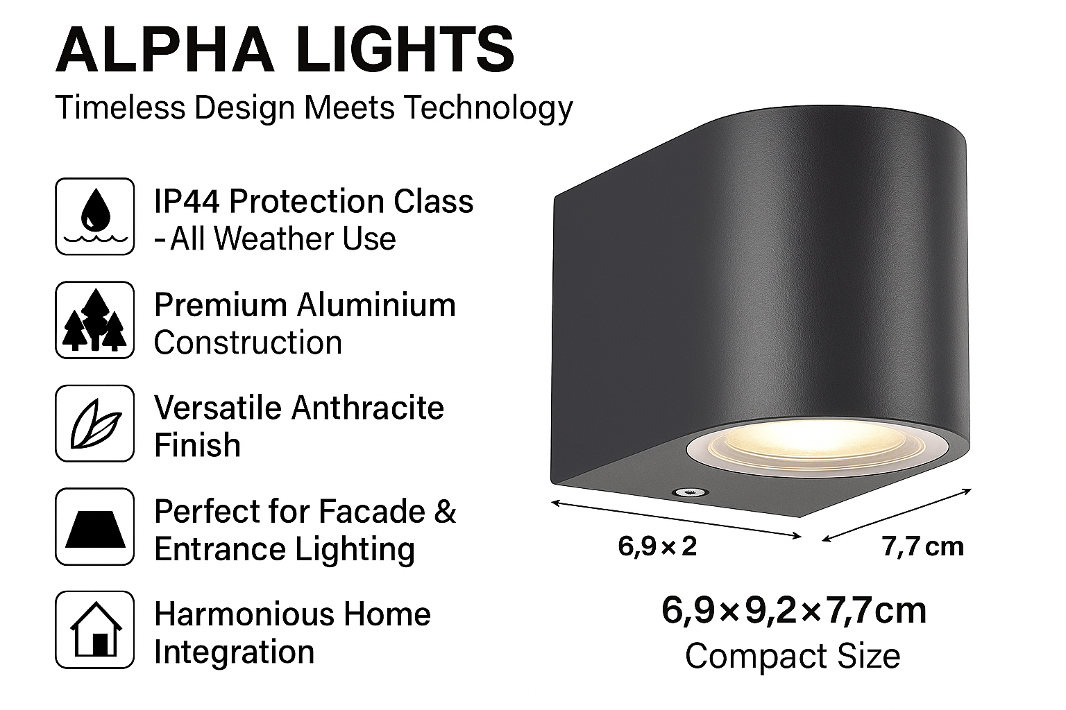 Crafted from high-quality aluminium and finished in an elegant anthracite matte coating, this LED light offers excellent performance with minimal maintenance. Thanks to its IP44 rating, it resists splashing water and harsh outdoor elements, making it ideal for façade lighting, garden walls, balconies, porches, and building exteriors. At the same time, its refined, rounded silhouette blends beautifully into indoor interiors such as hallways, home offices, and bedrooms.