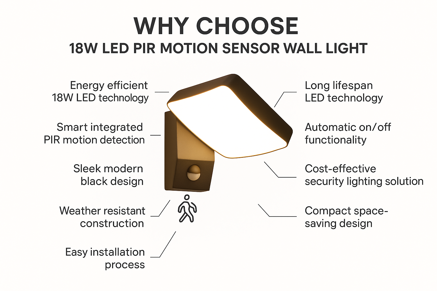 Our 18W LED PIR Motion Sensor Outdoor Wall Light offers powerful, energy-efficient illumination with smart motion detection for enhanced outdoor security. Featuring a sturdy build, IP44 waterproof rating, and sleek design, this wall light is ideal for gardens, porches, driveways, and pathways, combining style and functionality for any modern home.