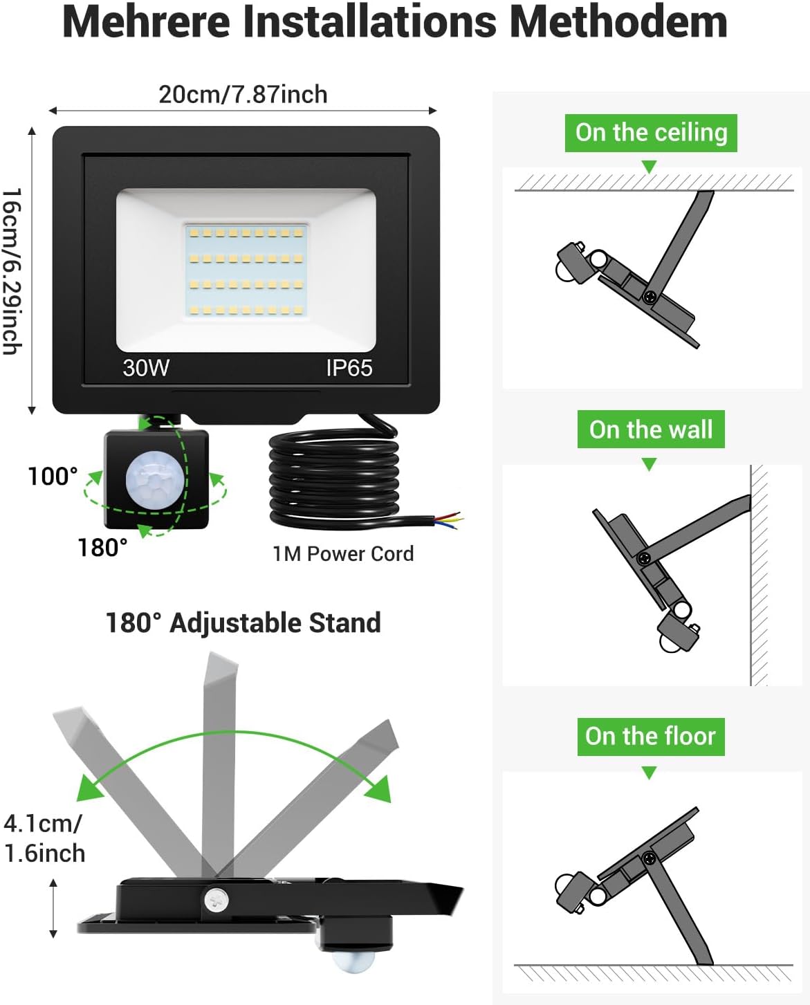 The IP65 waterproof design and silicone sealing ring ensure reliable performance in rain, snow, and harsh weather. Energy-saving technology allows the 30W LEDs to replace 180W traditional bulbs, saving over 85% on electricity bills. With a simple corner bracket design and 1-meter long cable, installation is quick and hassle-free.