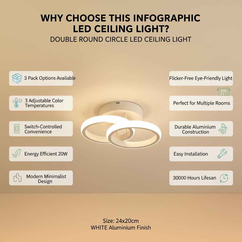 Transform your interior lighting with the Double Round Circle Dimmable LED Ceiling Light, a modern white dual-ring ceiling lamp designed to elevate both style and comfort. Crafted from durable aluminium with a PC cover, this 20W LED ceiling light delivers balanced brightness with a contemporary look that suits modern homes and offices. Its compact 24×20cm size makes it ideal for spaces where elegant design and efficient lighting are equally important.