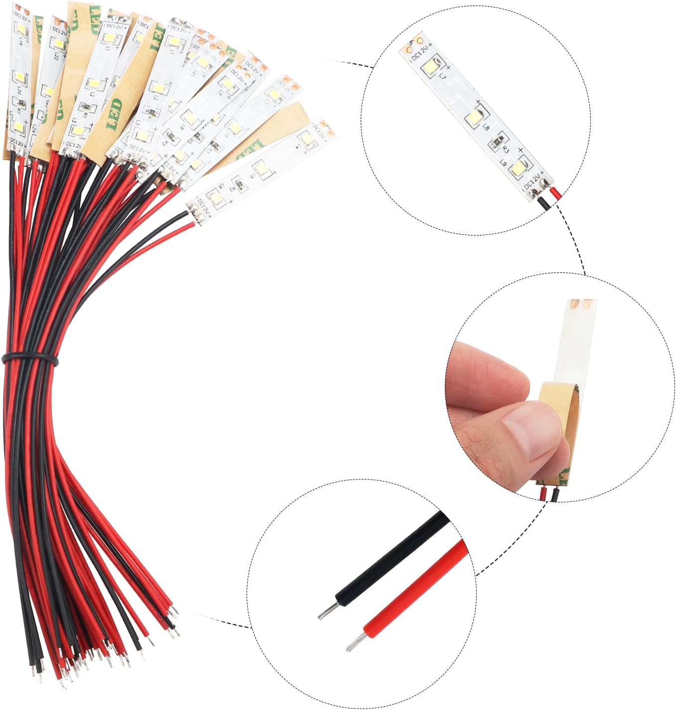 Upgrade your lighting projects with this 25PCS set of 50mm prewired LED strip lights, designed with high-efficiency 2335 SMD chips. Operating on a wide voltage range of 12V–18V, these LED strips provide bright, non-flickering white illumination with a 120° beam angle. Each strip measures 8mm in width, making it flexible enough to fit curved surfaces, corners, and compact spaces. Pre-tinned pigtail wire ends ensure simple plug-and-play installation, while strong adhesive backing allows secure mounting on smooth surfaces. Lightweight, durable, and safe with low heat emission, these strips are perfect for hobbyists, miniature model builders, and electronic projects. From dollhouse lighting to decorative accents, these versatile strips offer reliable and creative illumination with ease of use and long-lasting performance.