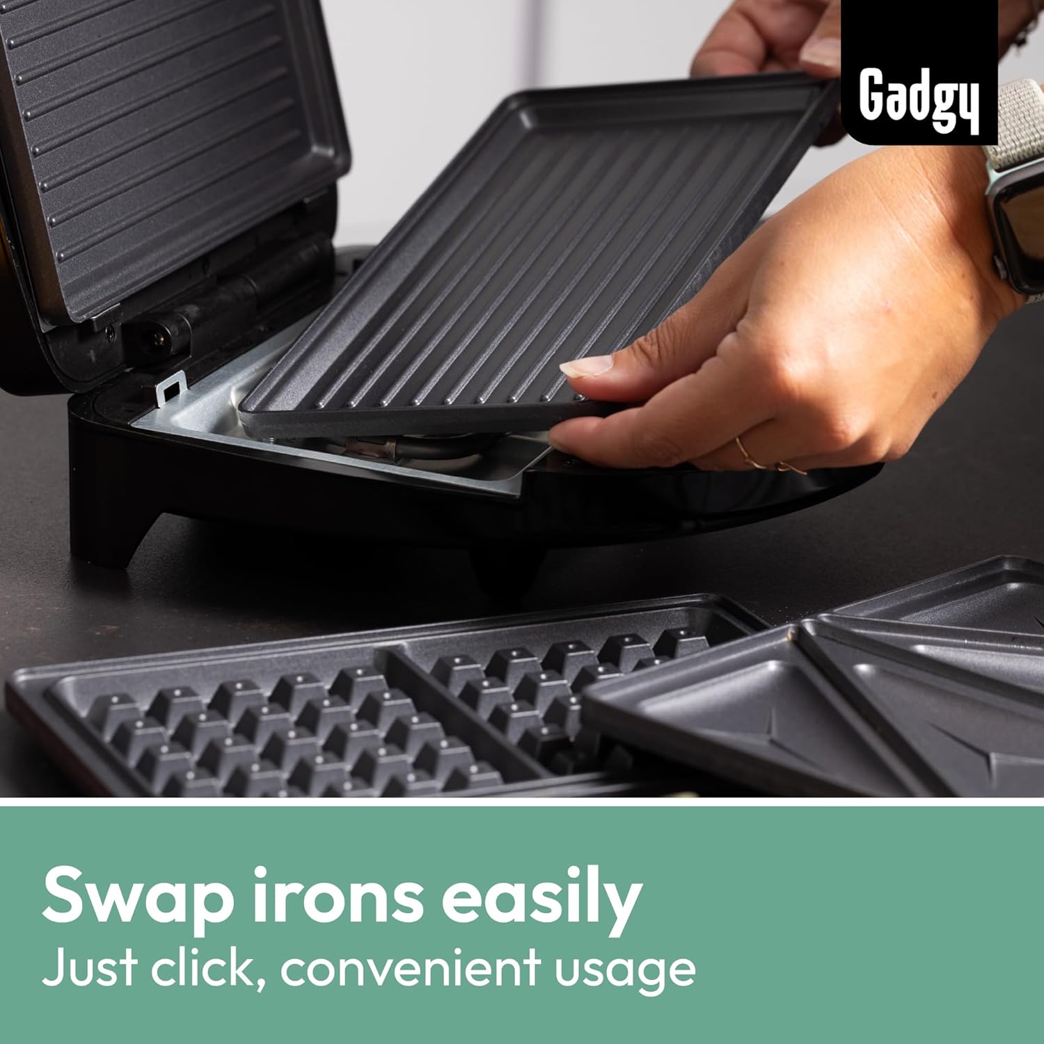 Removable Non-Stick Plates: Waffle plate, sandwich plate, and grill plate for easy cooking and cleaning.