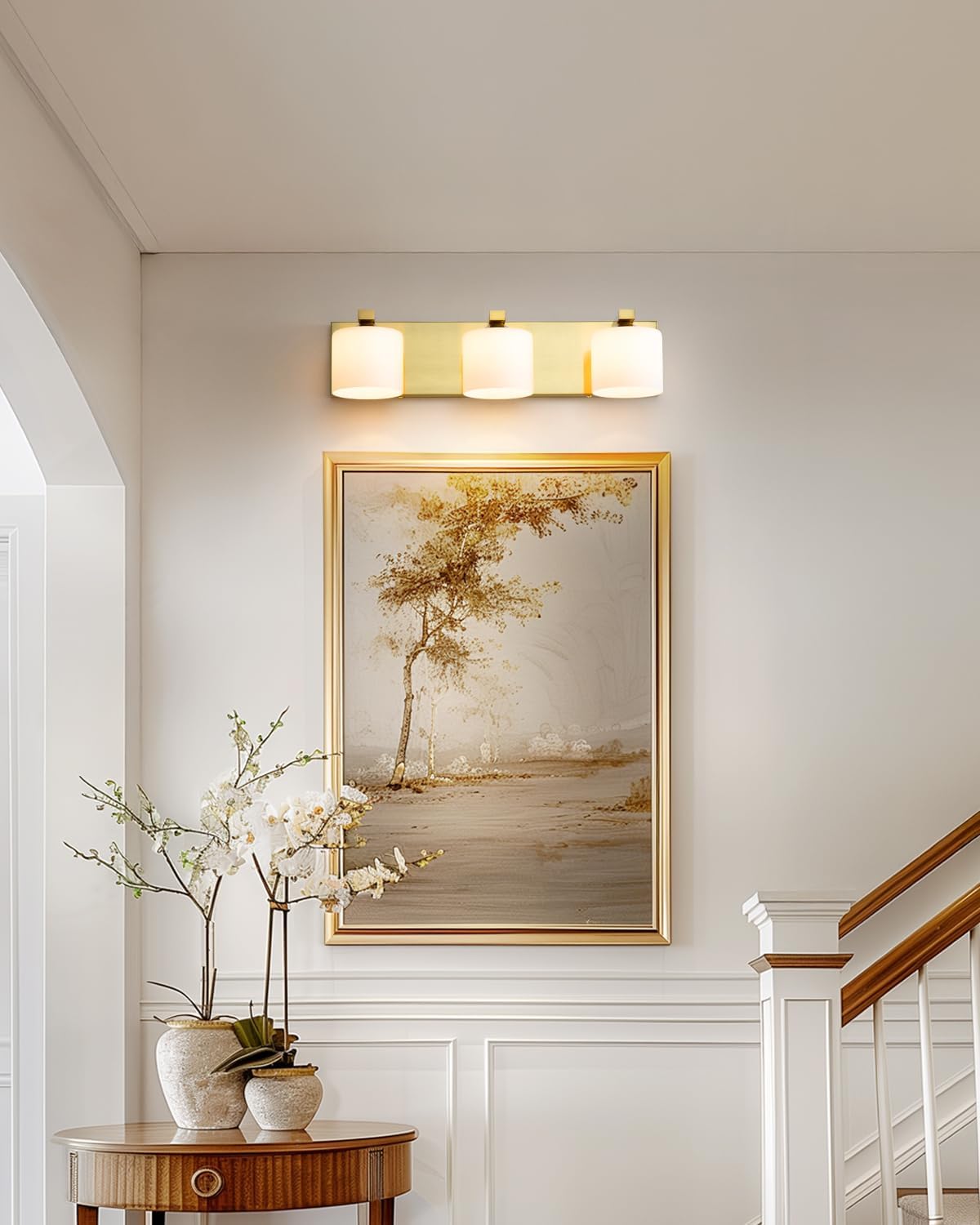 Our 3-light bathroom vanity light combines elegance and functionality with a sleek matte brass finish and frosted white glass shades. Designed for versatile use, it provides soft, evenly diffused illumination ideal for bathroom mirrors, dressing tables, or hallways. The fixture supports dimmable LED bulbs, allowing you to adjust brightness for optimal ambiance, while its high-quality metal construction ensures long-lasting durability. This modern wall sconce enhances any room with a sophisticated look and is perfect for bedrooms, living rooms, or corridors.