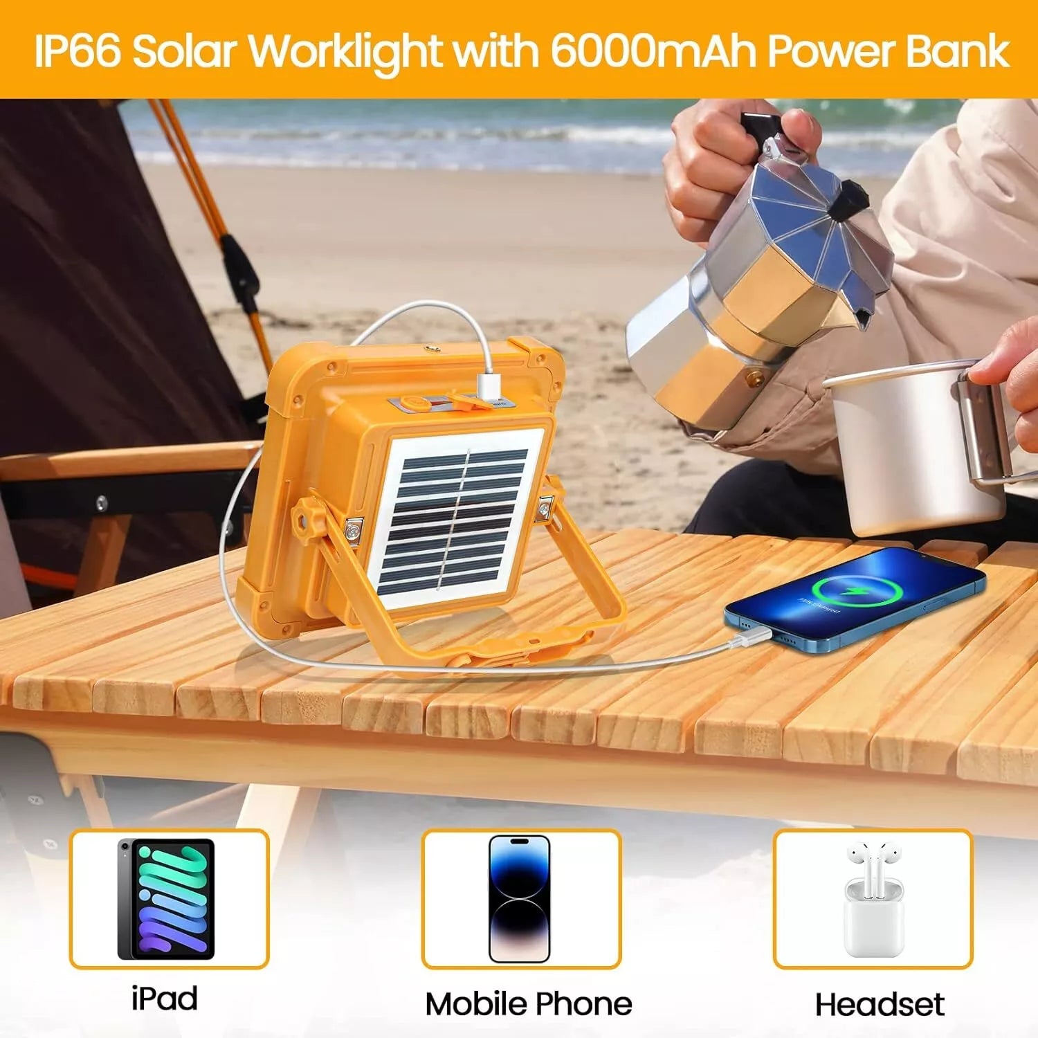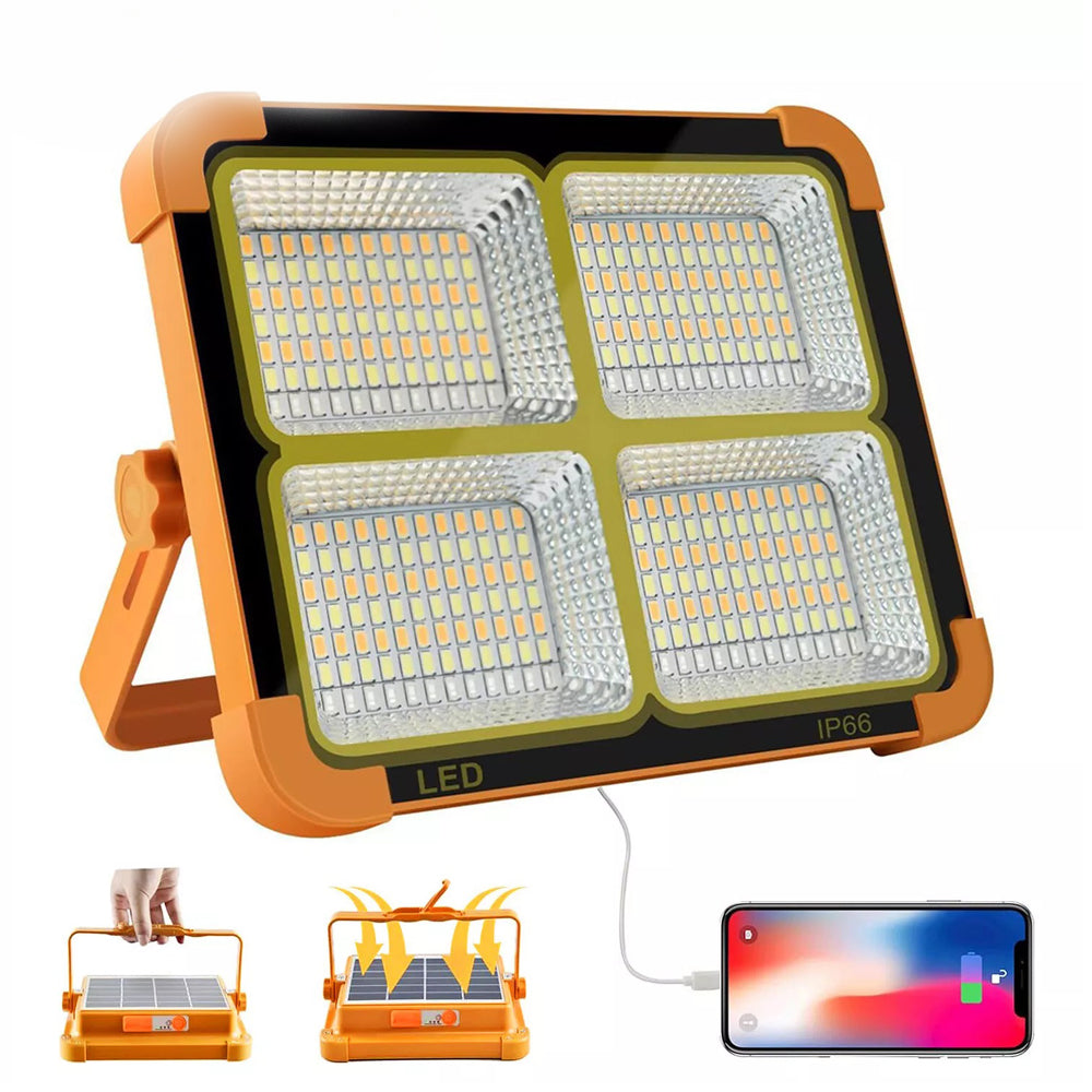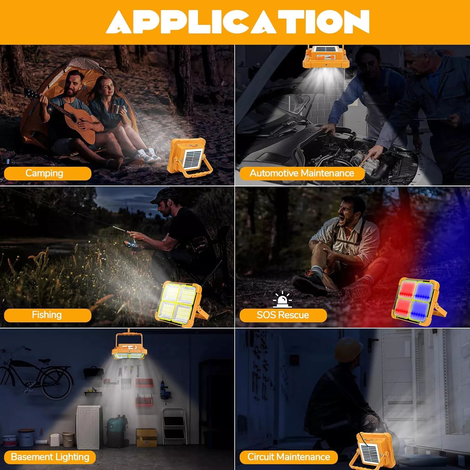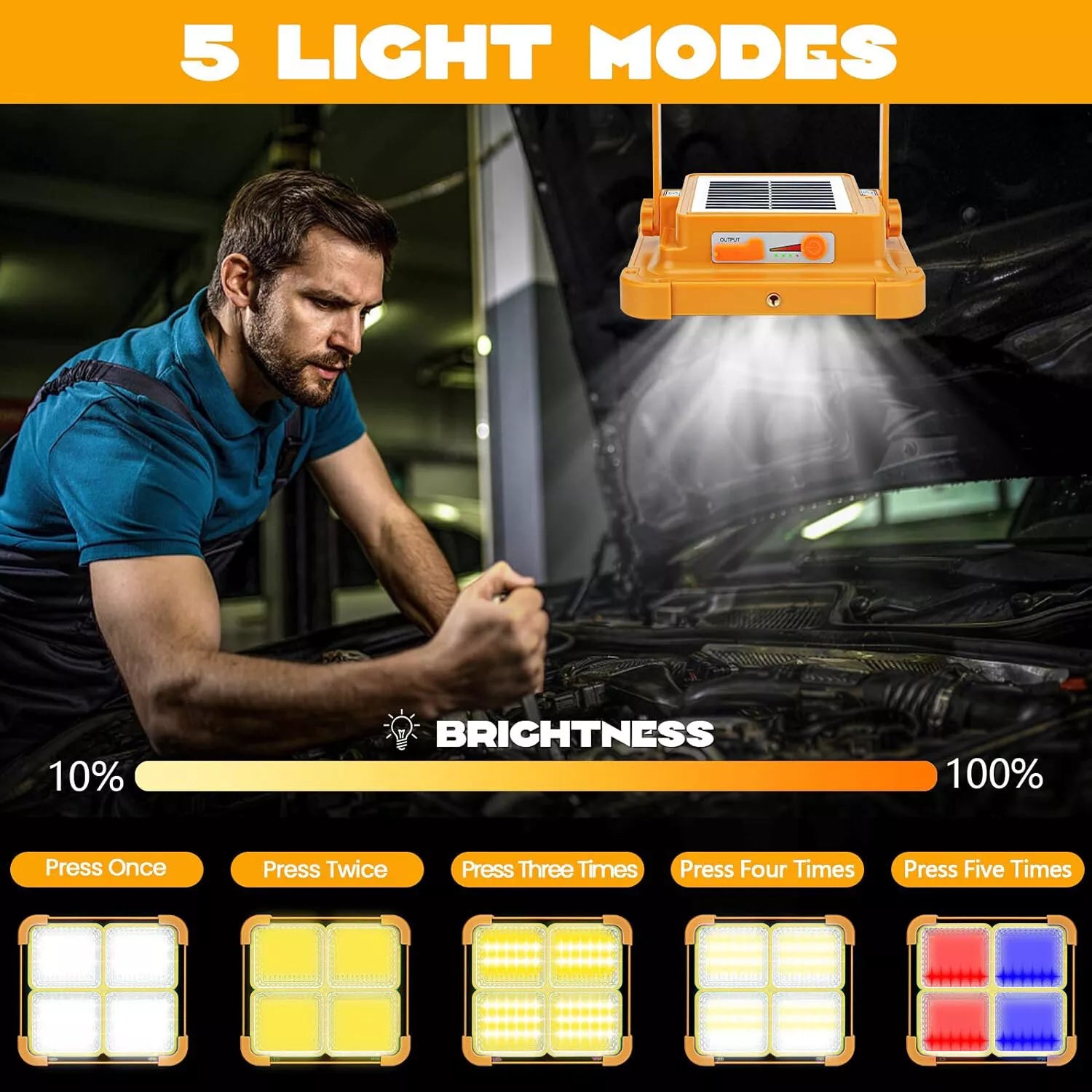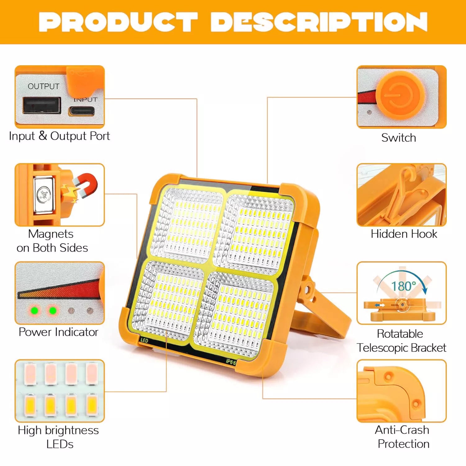 Illuminate your workspace or outdoor adventures with the 3000W Rechargeable LED Solar Work Light. Delivering a powerful 10000 lumens, this portable floodlight features 264 high-efficiency LEDs to provide bright and uniform lighting. Its versatile 5-mode functionality includes general illumination and an SOS distress signal, making it ideal for camping, construction, emergency situations, and backyard projects. Designed with durability in mind, the IP66 waterproof rating ensures reliable performance in all weather conditions. With built-in 18650 rechargeable batteries, USB and solar charging options, foldable hooks, magnetic mounting, and a 180° adjustable handle, this work light is your all-in-one lighting solution. It also functions as a power bank, providing emergency charging for mobile devices, enhancing its practicality for outdoor use.