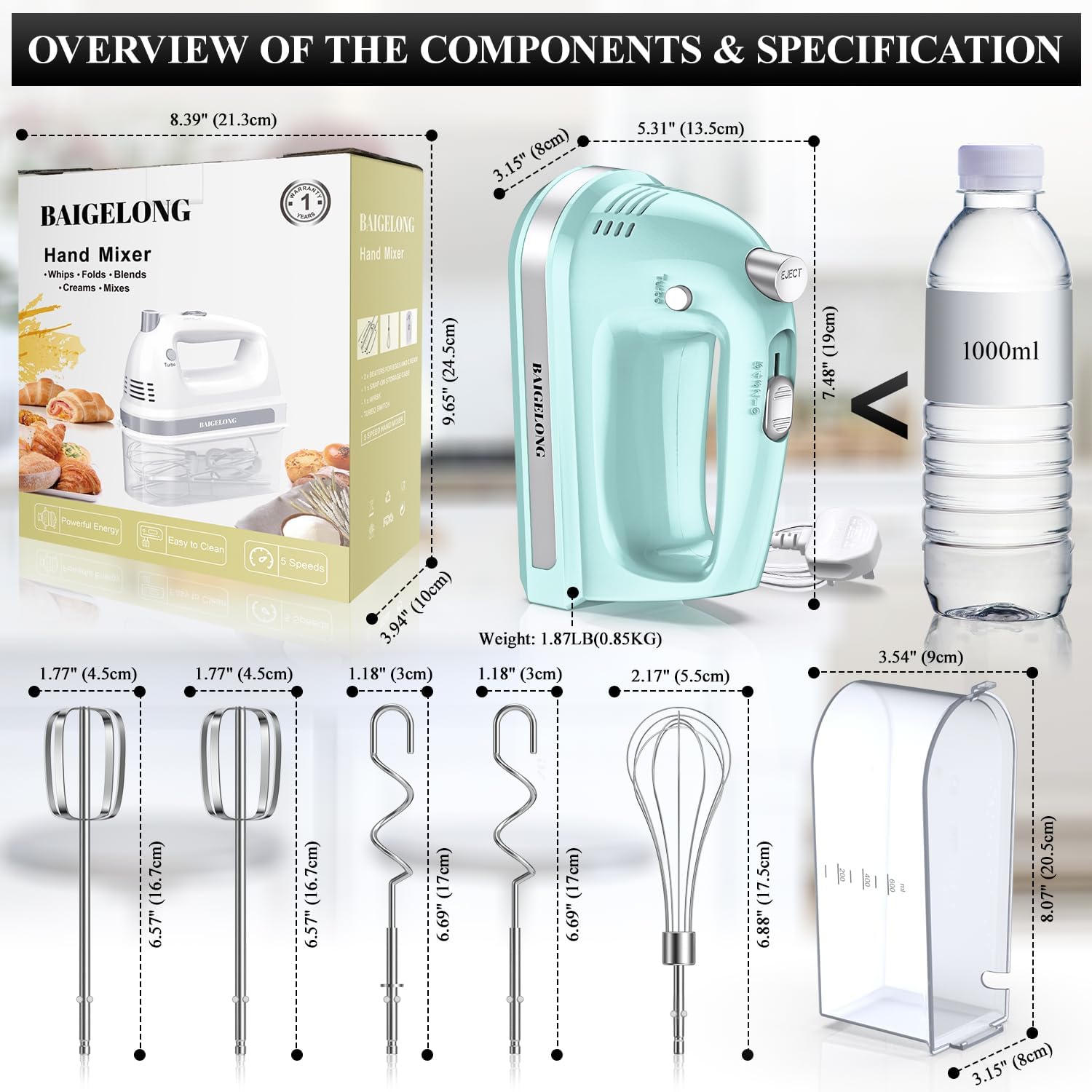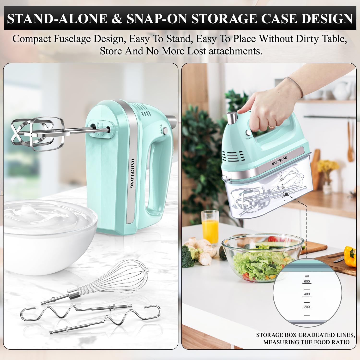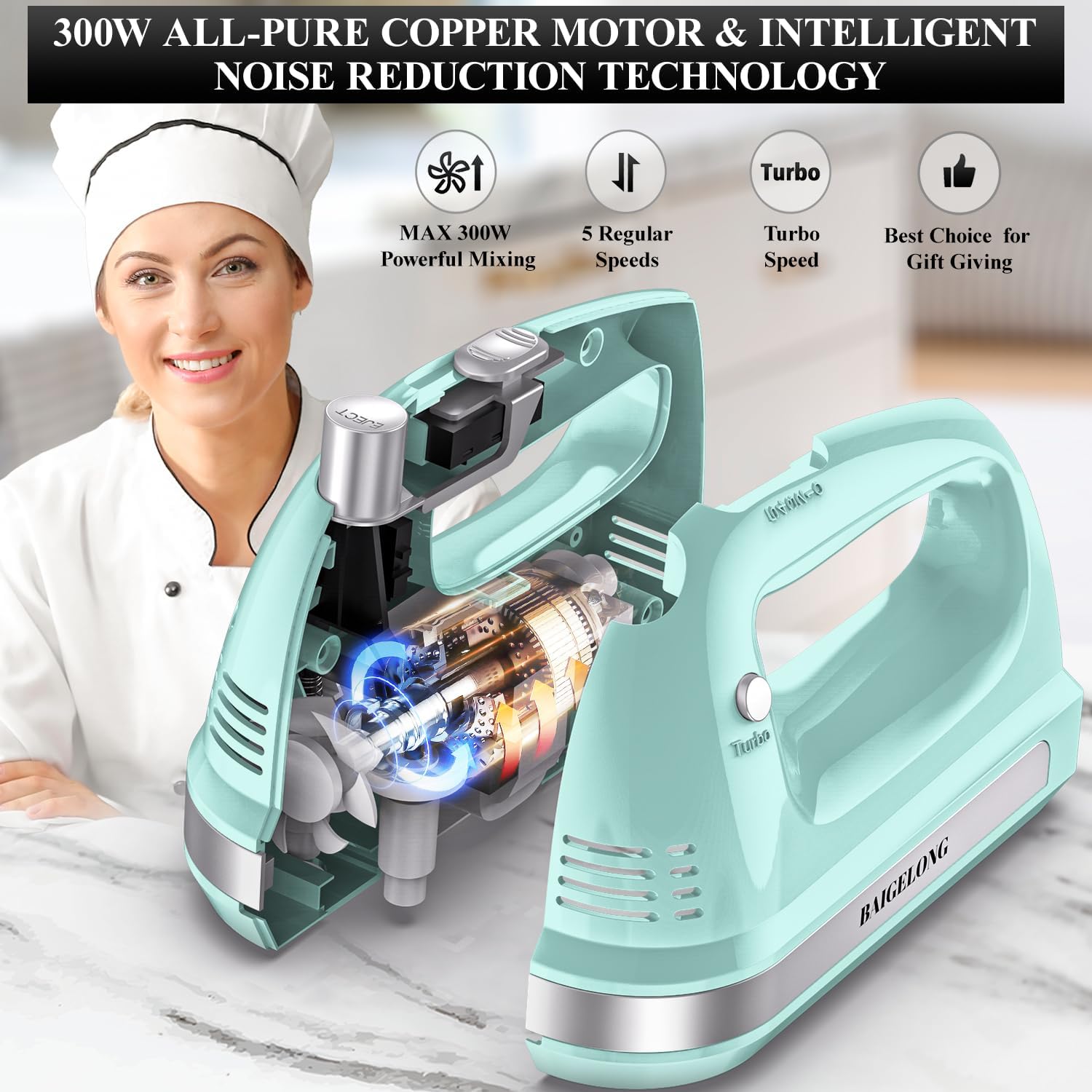 All-in-1 300W Multifunctional Mixer – Includes 1 whisk, 2 beaters, 2 dough hooks, and 1 snap-on storage box for versatile baking needs.