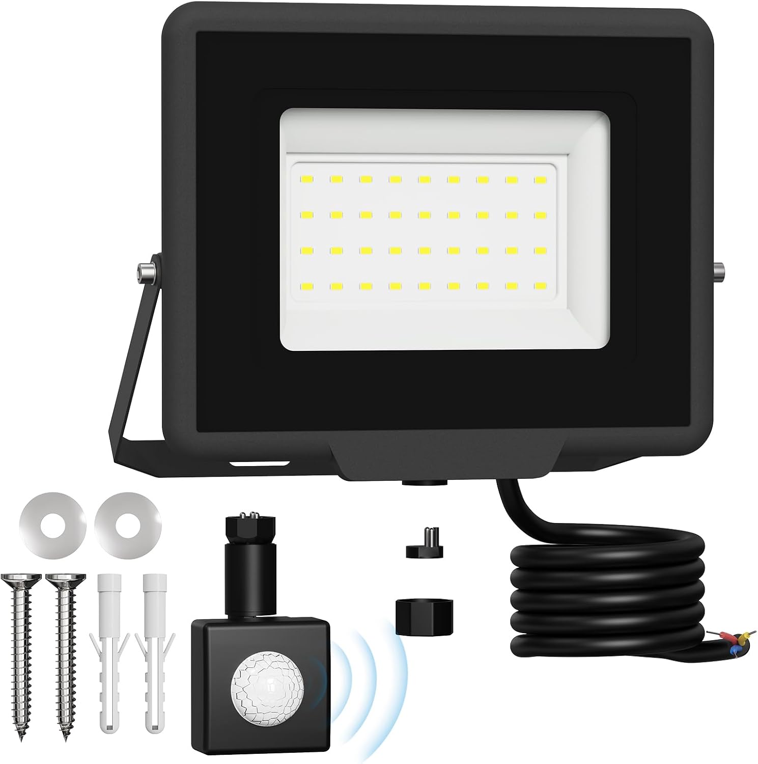 Our 30W LED Security Light with Motion Sensor provides powerful daylight white illumination at 6500K, making it ideal for garages, gardens, patios, and backyards. Equipped with a wide 120° PIR motion sensor, it detects movement up to 8 meters away and offers adjustable settings for lighting duration (10–480 seconds) and day/night operation. Built with high-quality LED chips, it delivers stable brightness while saving up to 85% on electricity compared to traditional lighting. With an IP65 waterproof rating, durable materials, and rubber-sealed connectors, this floodlight ensures long-lasting performance even in harsh outdoor conditions. Designed for quick installation at heights of 3–5m, it’s a reliable solution for home and commercial security lighting.