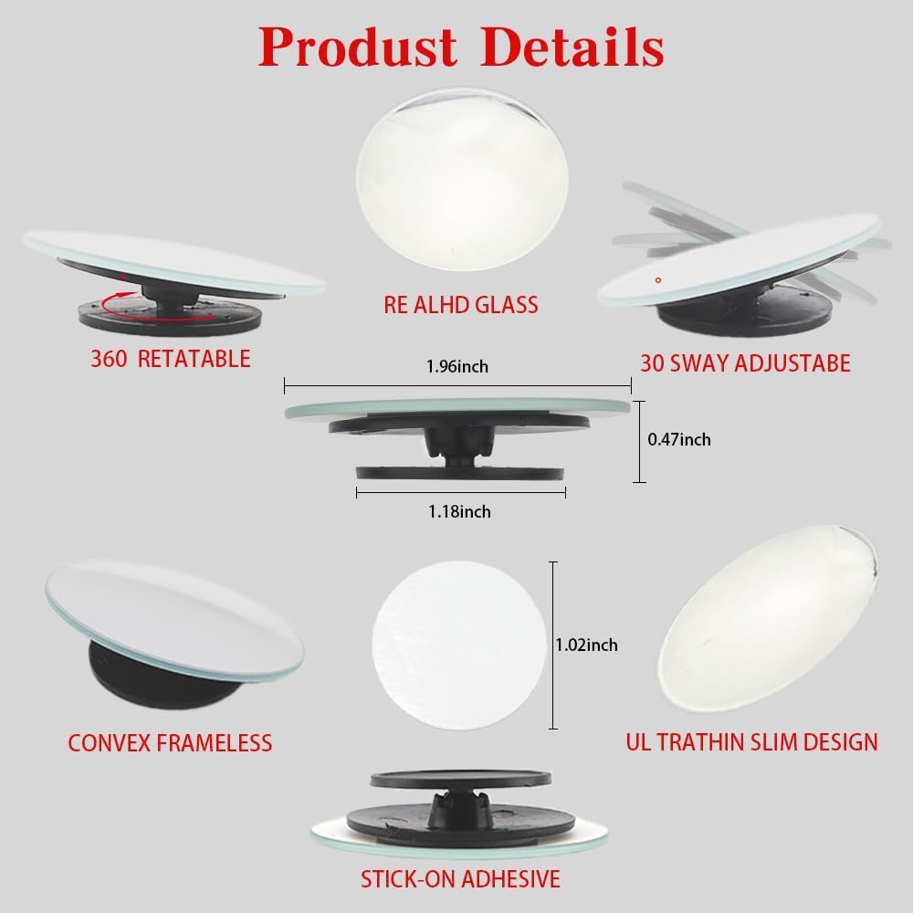 Our 360° Rotatable Frameless Blind Spot Mirrors are designed to enhance your driving safety by providing a wider and clearer field of view. Featuring a convex HD glass lens and frame-free design, these mirrors eliminate side and rear blind spots, ensuring safer lane changes, reversing, and overtaking. The waterproof and rustproof construction makes them suitable for all weather conditions, while the 360° rotatable and swing adjustable base allows you to customize the viewing angle with ease. Ideal for cars, trucks, SUVs, and RVs, these blind spot mirrors are a must-have accessory for confident and stress-free driving.