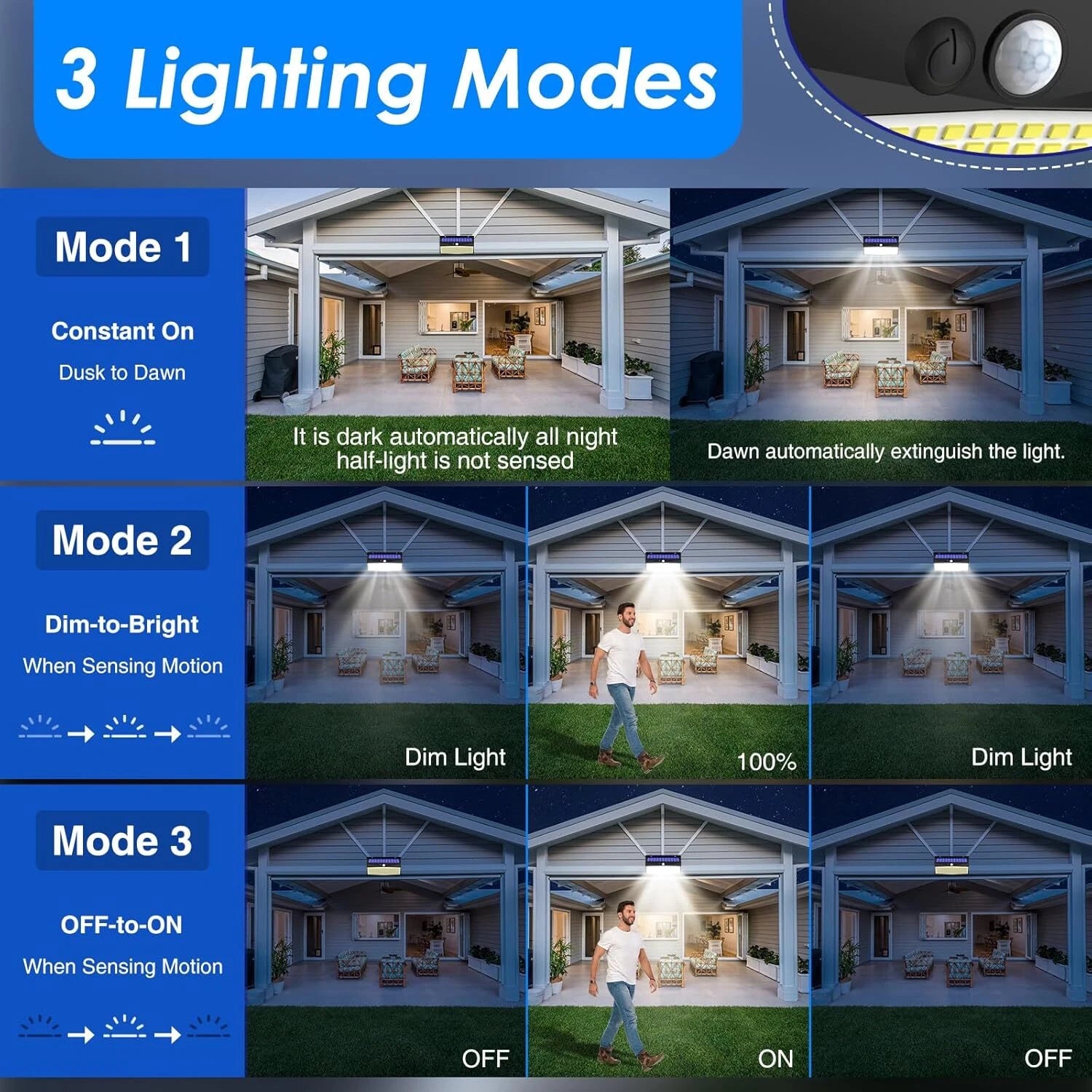 Powered by solar energy, it automatically charges during the day and activates at night through an intelligent dusk-to-dawn sensor. The built-in motion detector enhances security by brightening the area when movement is detected. With three lighting modes and low-voltage 3V output, it ensures energy efficiency without compromising performance.