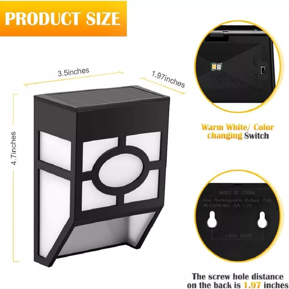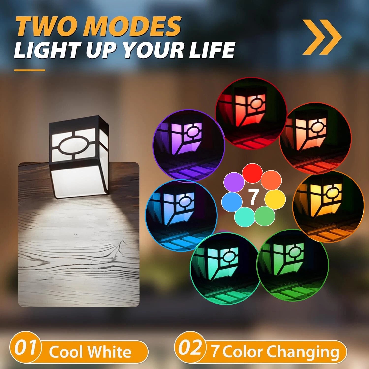 Illuminate your outdoor spaces with the 4 Pack Black Solar LED Fence Lights. Perfectly designed for gardens, pathways, decks, stairs, and patios, these LED lights offer energy-efficient, low-voltage illumination with a modern aesthetic. Equipped with solar panels, they automatically charge during the day and light up at dusk, providing hassle-free, eco-friendly lighting. The lights feature 7 color-changing RGB options, dusk-to-dawn sensors, and two-speed settings, allowing you to create the perfect ambiance for any outdoor occasion. With an IP65 waterproof rating and durable plastic construction, these lights withstand all weather conditions, ensuring long-lasting performance. Easy to install and wall-mounted, they are ideal for enhancing safety, style, and visibility around your home.