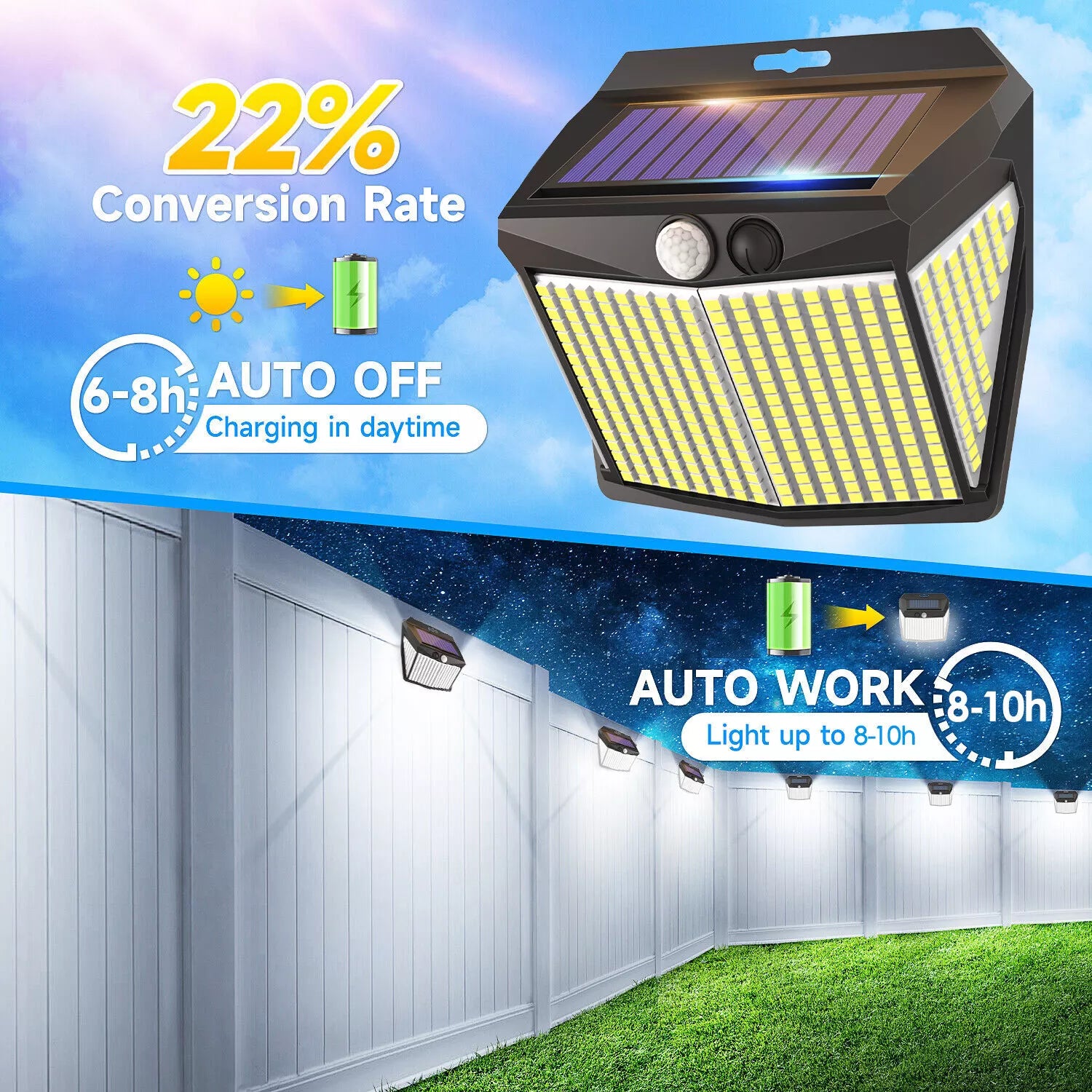 Illuminate your outdoors efficiently with the 412 LED Solar Power PIR Motion Sensor Wall Light, designed for superior brightness and smart energy efficiency. With a powerful 3000 lumens output and ultra daylight 6500K color temperature, this wall-mounted solar lamp ensures maximum visibility and safety for your garden, patio, pathway, or garage. Equipped with an advanced PIR motion sensor, it automatically activates when movement is detected, conserving energy while providing reliable illumination. Built from high-quality ABS plastic, this IP65 waterproof light is engineered to withstand rain, snow, and extreme weather conditions, ensuring long-lasting durability. Perfect for those who value sustainability, security, and style in one lighting solution.