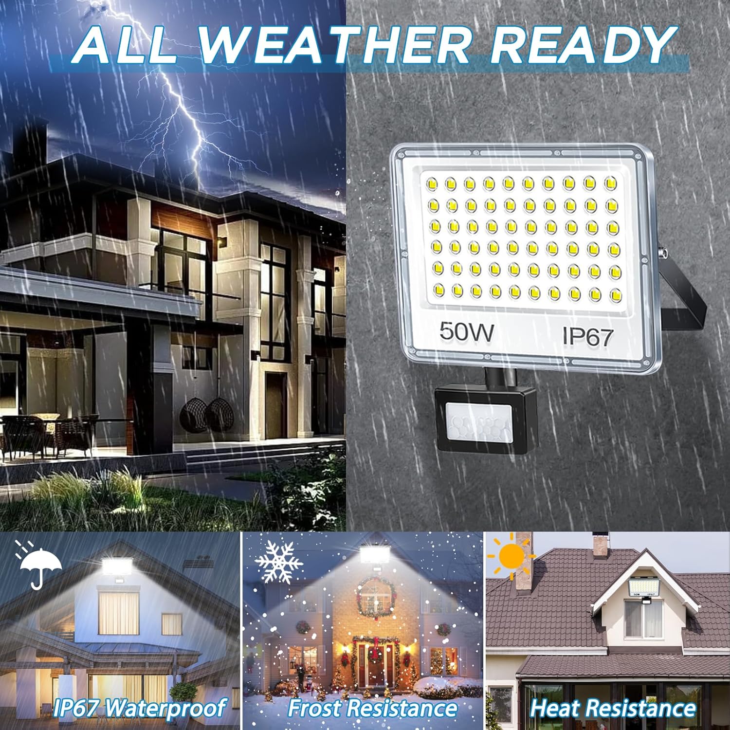 Upgrade your outdoor lighting with the TASINUO 50W LED Security Light featuring an advanced PIR motion sensor. Designed with 60 high-efficiency SMD 2835 LED beads, this floodlight delivers an impressive 5000 lumens of ultra-bright illumination while reducing heat build-up and saving up to 85% on energy costs. With an IP67 waterproof rating, durable die-cast aluminium housing, and an adjustable sensor, it provides reliable performance in all weather conditions. Perfect for gardens, patios, garages, gates, and commercial spaces, this robust floodlight ensures long-lasting security and peace of mind.