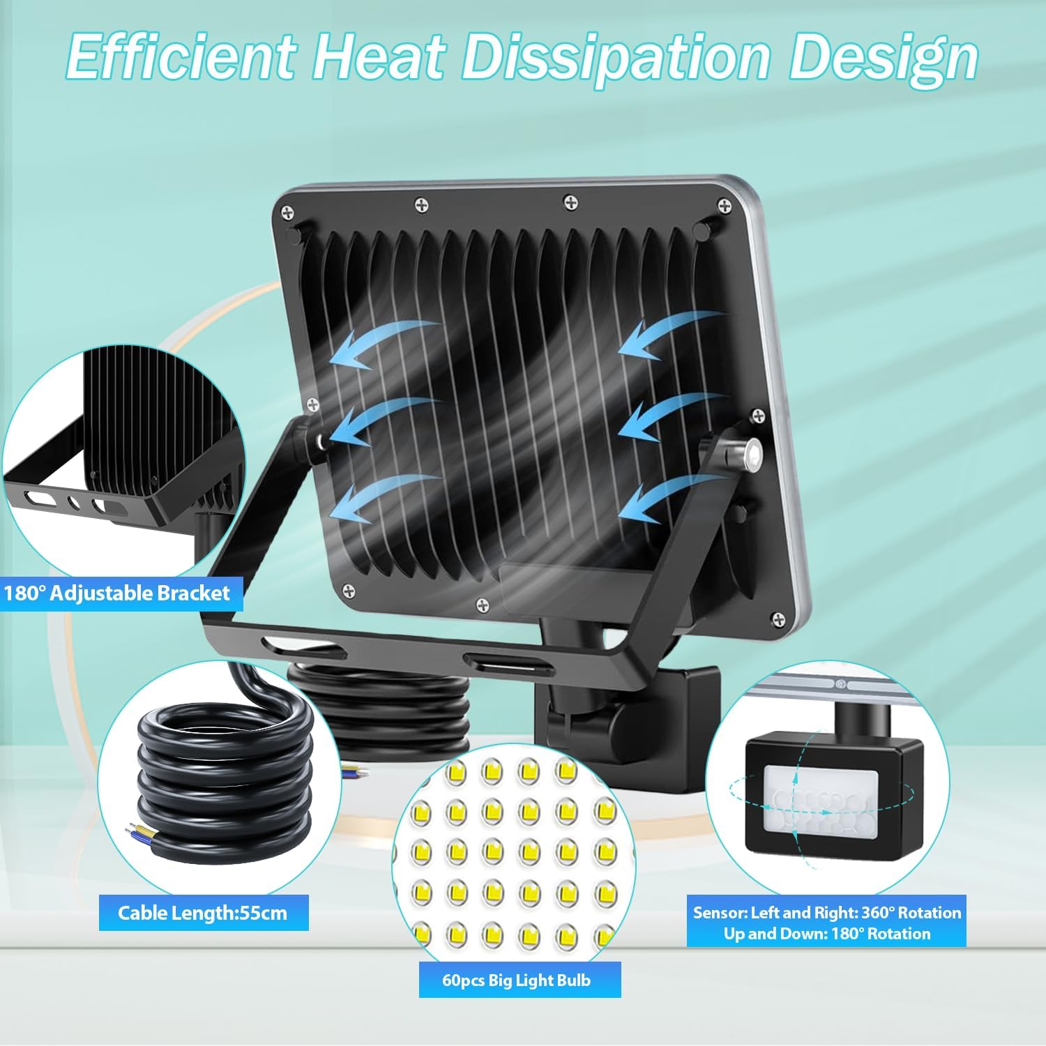Illuminate your outdoor space with the TASINUO 50W LED Security Light with PIR Motion Sensor. Designed for efficiency, durability, and reliable performance, this floodlight delivers an impressive 5000 lumens of brightness while reducing energy consumption by up to 85%. The integrated PIR motion detector offers adjustable settings for sensitivity, lighting duration, and day/night operation, ensuring personalised control and security. Built with a high-grade aluminium body, a polycarbonate front cover, and an IP67 waterproof seal, this security floodlight withstands harsh weather conditions including heavy rain, snow, and extreme heat. With a lifespan of up to 50,000 hours, shock resistance, and anti-rust construction, it is an ideal lighting solution for gardens, garages, patios, driveways, yards, and industrial outdoor areas. Easy to install with a 180° rotatable mounting bracket and flexible PIR adjustment, this outdoor floodlight guarantees long-lasting protection and peace of mind.