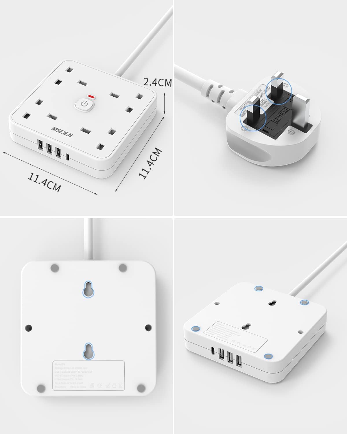 5M 4 Gang Extension Lead with USB C and 3 USB A Ports, Wall Mount Power Strip