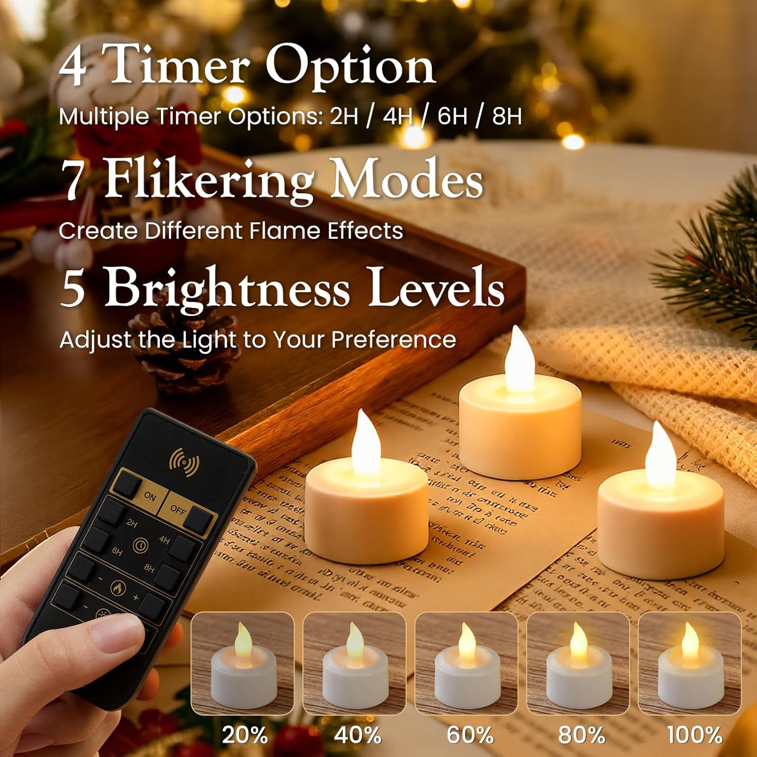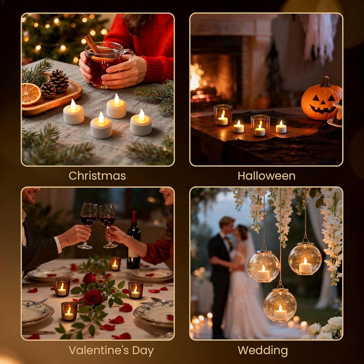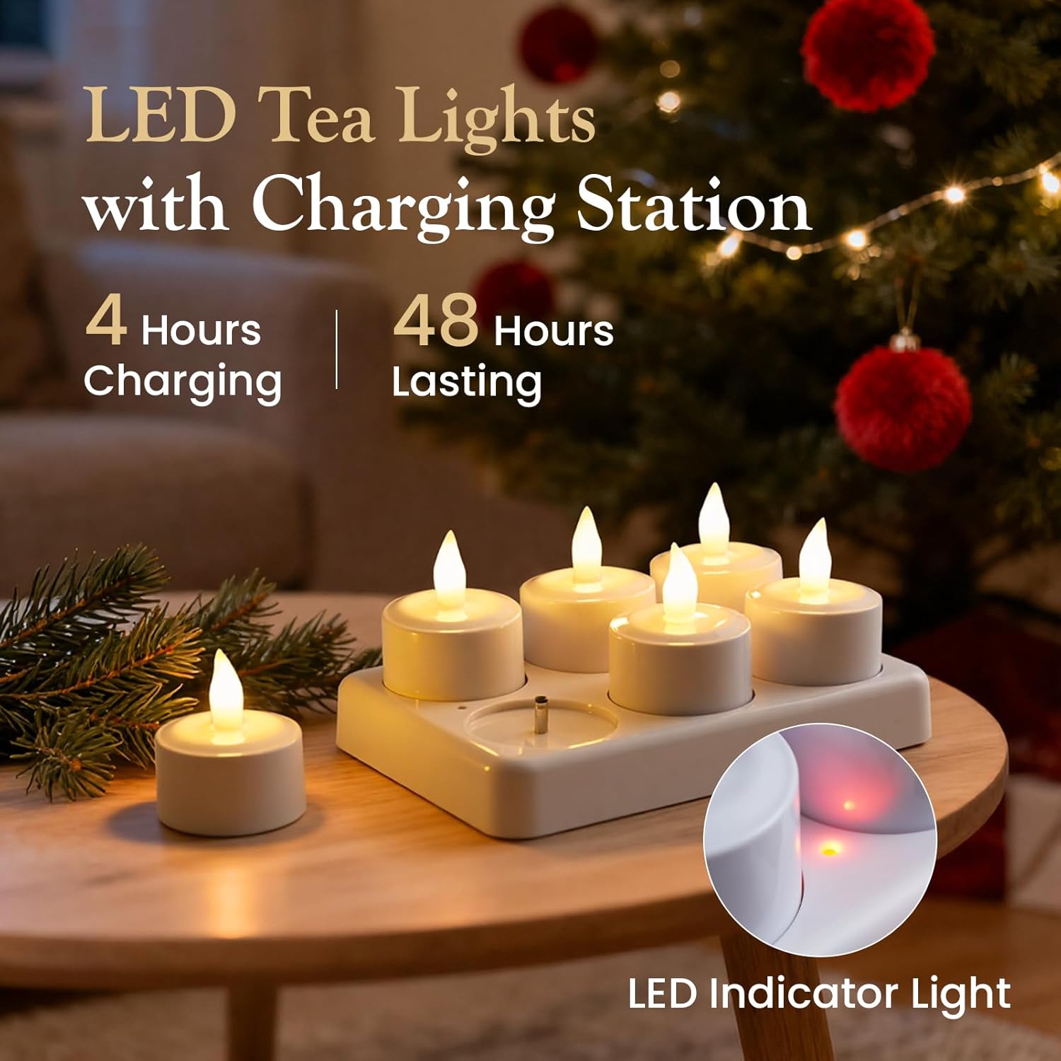 Each tea light includes a built-in rechargeable battery and works seamlessly with the included charging base, allowing all candles to be charged together. With remote control functionality, adjustable brightness, and timer settings, these flameless tea lights offer both beauty and convenience—perfect for home décor, festive celebrations, and thoughtful gifting.