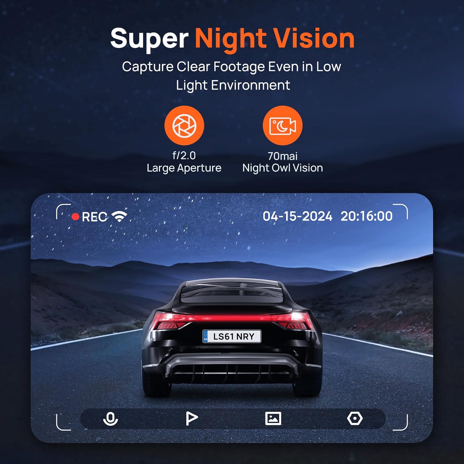 Experience ultimate driving security with the 70mai 2K Wifi Dash Cam M310. Designed for modern drivers, this high-resolution 1296P QHD dash camera captures every detail on the road, from license plates to street signs, with unmatched clarity. The 130° wide-angle lens minimizes blind spots while 3D Noise Reduction and WDR technology ensure consistent, clear images even in low-light conditions.