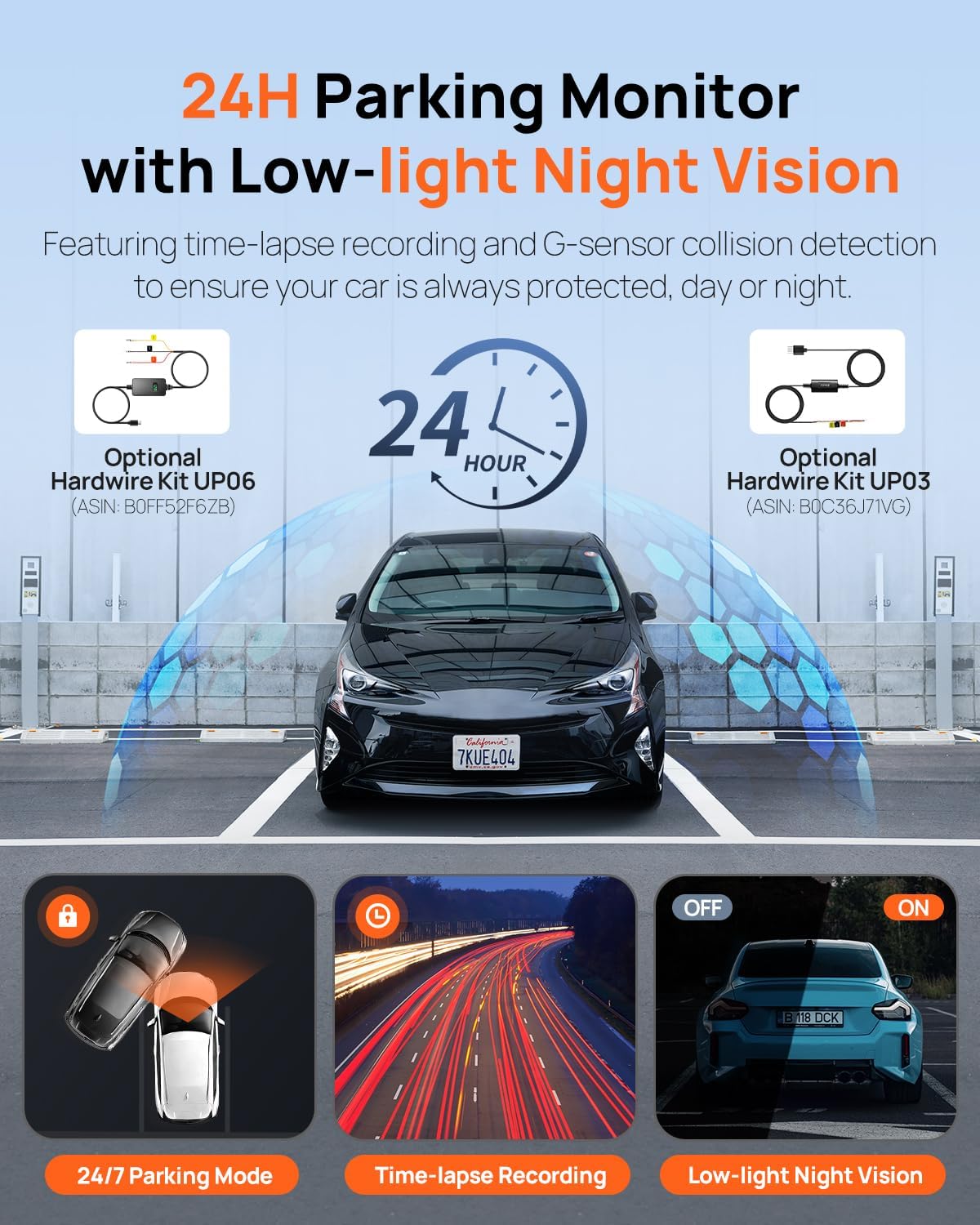 Equipped with F1.55 large aperture, this camera excels in dark environments, providing sharp, balanced video without noise. With built-in Wi-Fi and smartphone app integration, accessing your recordings has never been easier—view, download, and share your footage instantly. The 24/7 parking surveillance mode with G-Sensor automatically locks footage during collisions or parking incidents, safeguarding your vehicle even when you’re away.