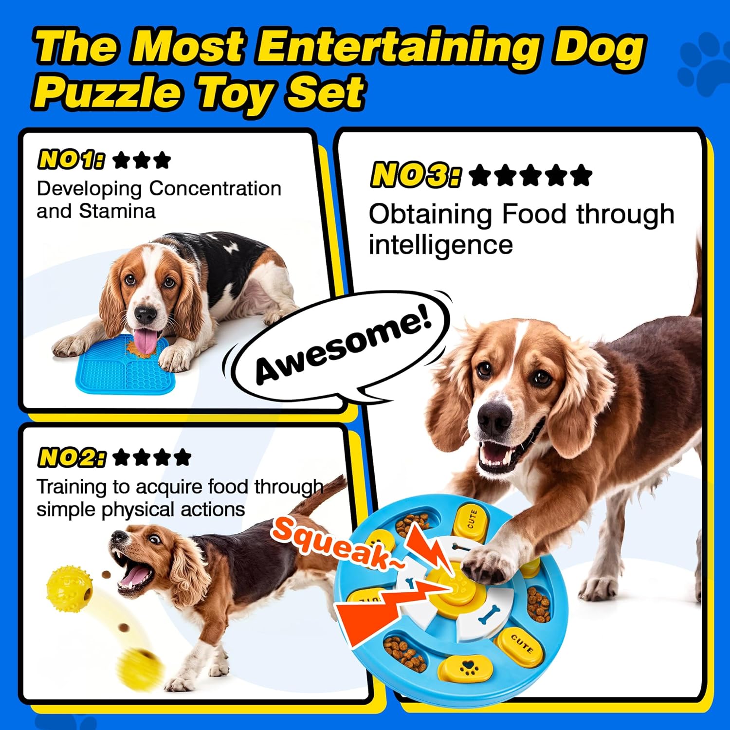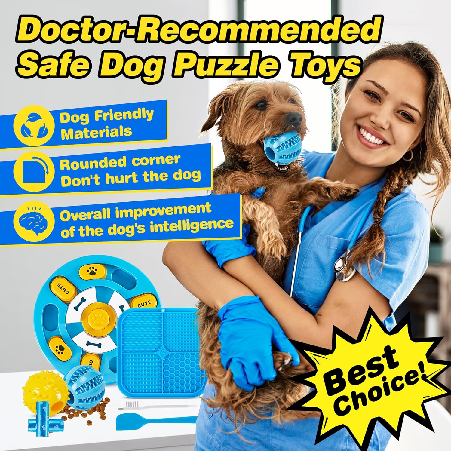 - Includes dog puzzle toys, licky mats, and treat balls