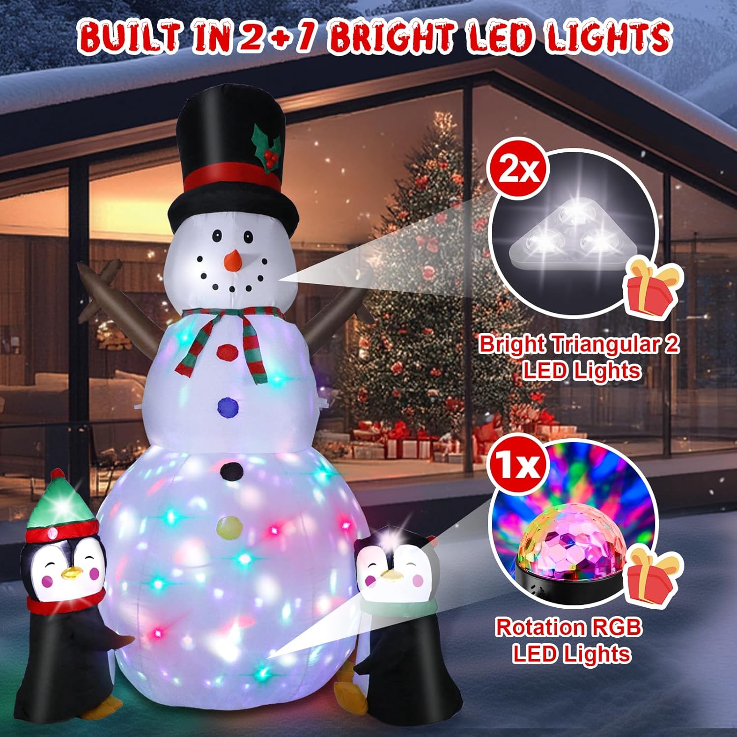 Our 8FT Christmas Inflatable Snowman with Penguins brings festive cheer to your home and garden. Featuring a charming snowman wearing a black hat and scarf, accompanied by two adorable penguins, this holiday decoration is designed to be the centerpiece of your Christmas celebrations. Equipped with built-in rotating LED lights, it creates a vibrant, colorful display that brightens up your indoor or outdoor spaces. Made from durable, IP44 waterproof polyester, this inflatable is suitable for prolonged use in all weather conditions. Quick to inflate and easy to secure with stakes and ropes, it offers hassle-free setup for both residential and commercial holiday décor. Perfect for yards, patios, gardens, and parties, it adds joy, warmth, and festive spirit wherever it is displayed.