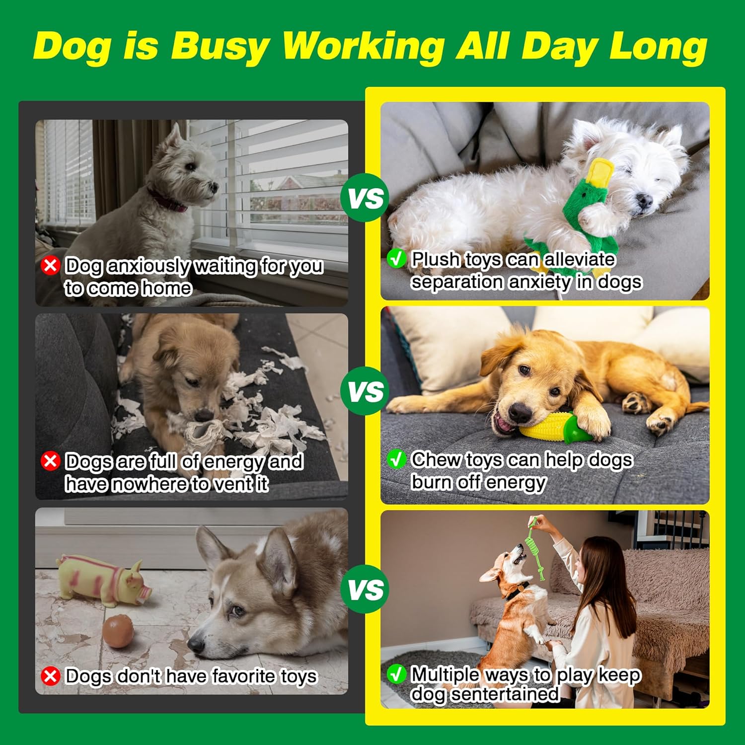 Our 9-piece indestructible dog toy set is designed for small to medium-sized dogs and puppies, combining durable oxford fabric with plush textures to provide safe and engaging play. These interactive toys feature varying squeaks to stimulate auditory enjoyment, while textures that mimic a mother dog's fur help soothe anxiety and offer comfort during solo play. Perfect for rewarding busy dogs with treats in a fun, exploratory manner, this set encourages interactive play, strengthens the bond between owner and pet, and ensures long-lasting durability for safe chewing and entertainment.