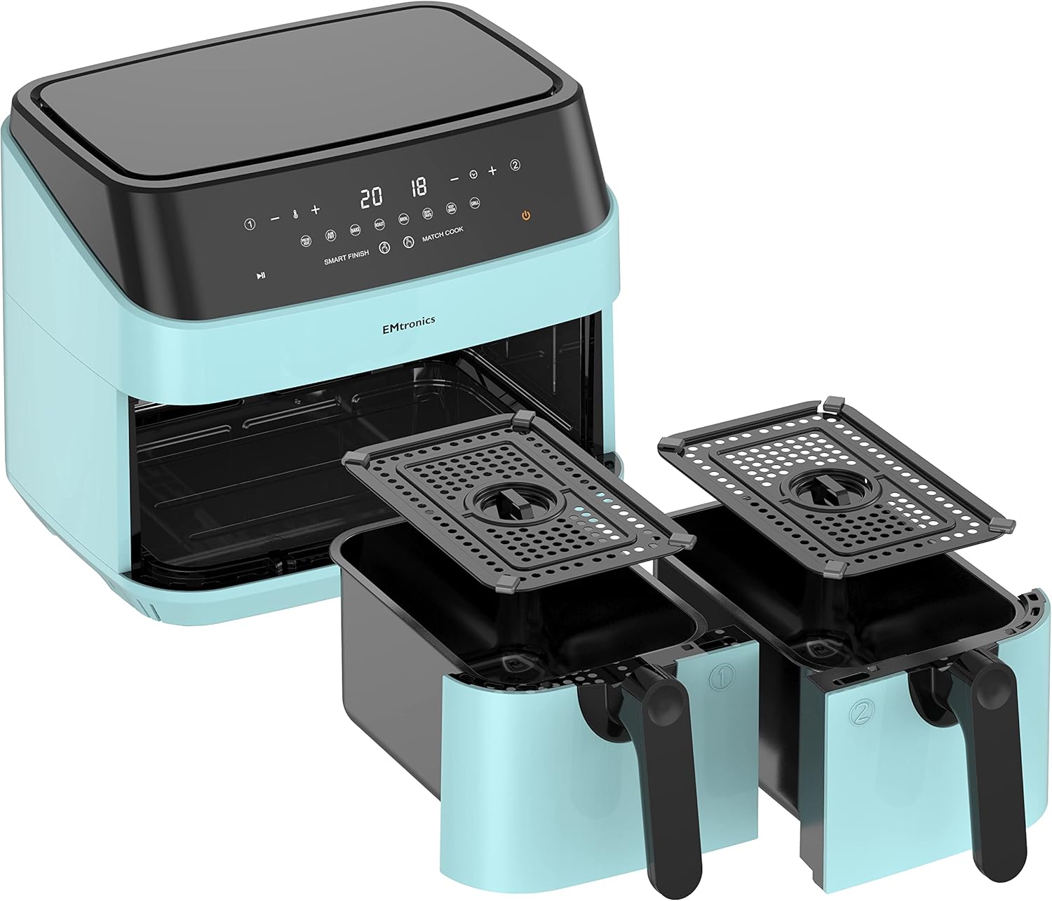 Our EMAFDD9LAQ Dual Air Fryer XXL 9L in Aqua Blue is designed for families who want healthier, faster, and smarter cooking. With its extra-large 9-litre dual basket capacity, you can prepare two different dishes simultaneously, saving time and energy while feeding the whole family.