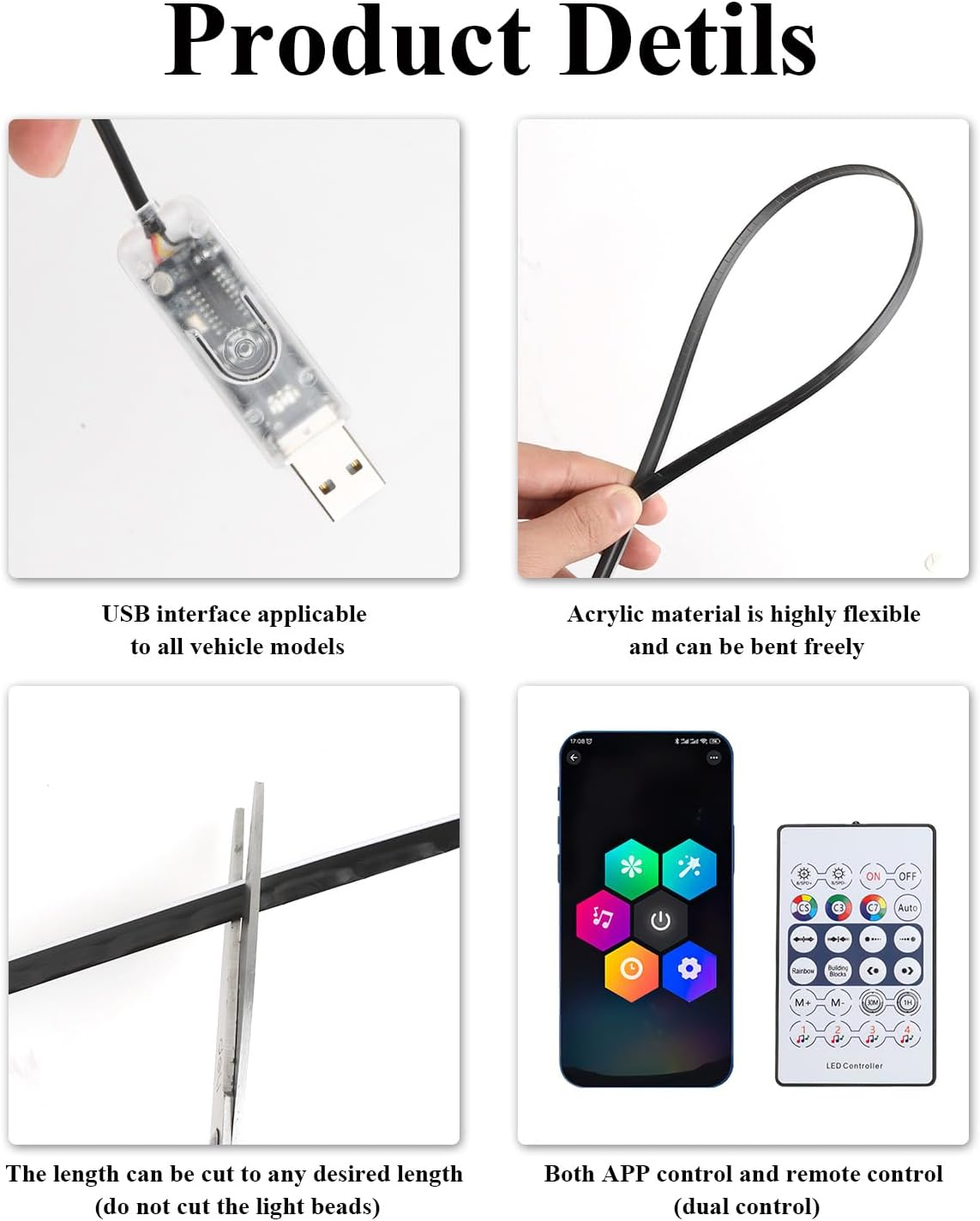 With three convenient control options including a smartphone app, remote control, and USB button, managing your lighting has never been easier. The built-in music sync feature reacts to sound, creating a lively atmosphere that moves with your favourite tunes. Its flexible 110cm fibre optic strip design ensures easy installation and compatibility with a wide range of vehicles, making it a perfect upgrade for everyday driving or special occasions.
