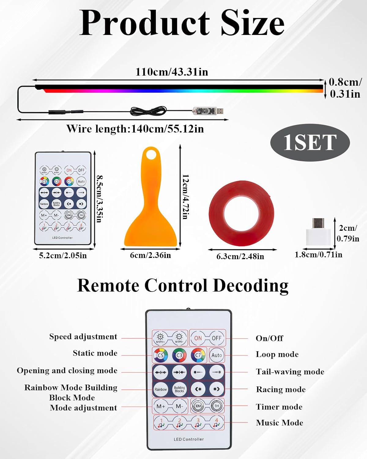 - 1 acrylic fiber optic strip measuring 43.3 inches (110 cm)