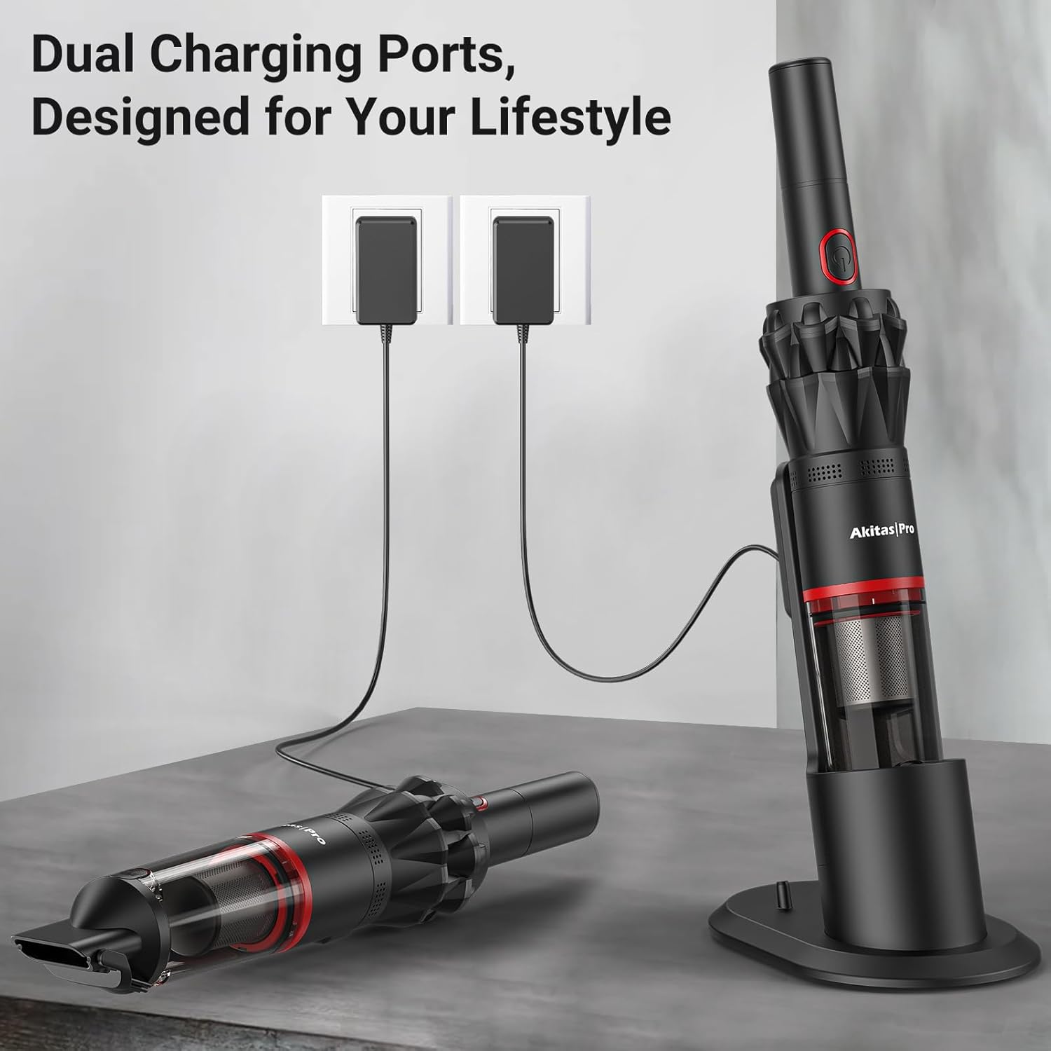 The HEPA and stainless-steel filters ensure clean, allergen-free air while maintaining long-term durability. Enjoy up to 26 minutes of runtime and fast charging in only 3.5 hours. With whisper-quiet operation, a one-touch dustbin, and a 2-in-1 toolset, the Akitas Pro H2 is designed for modern living — combining portability, power, and precision in one sleek red device.