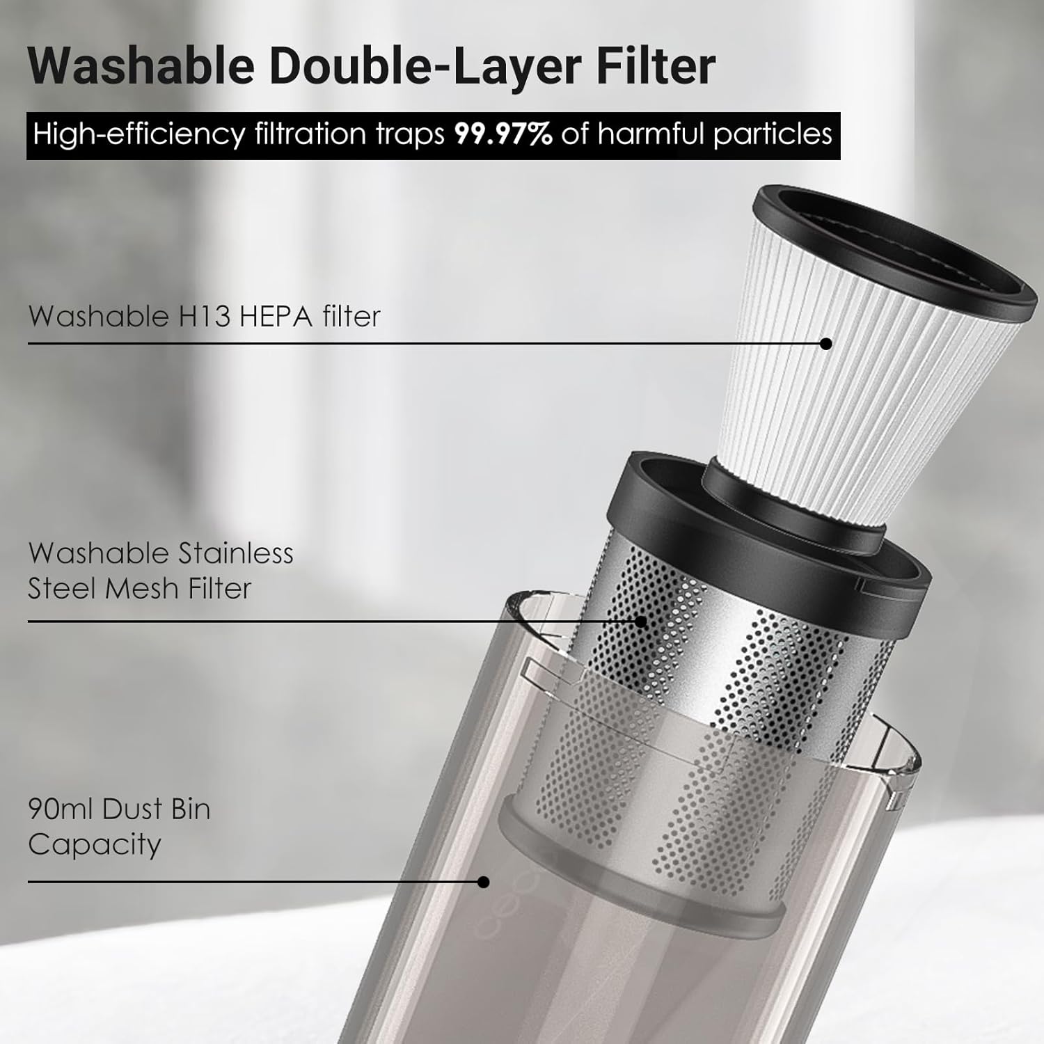HEPA and stainless steel filters trap fine dust, allergens, and pet dander.