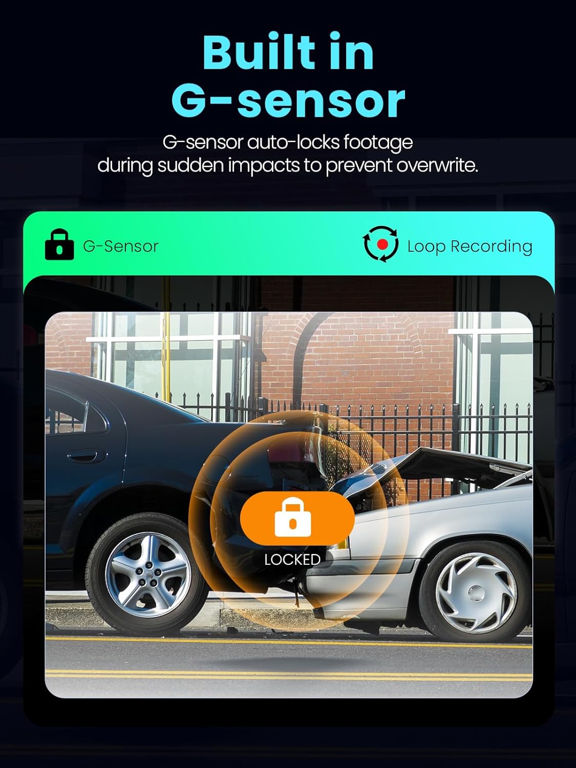 - Loop recording, G-sensor collision detection, and parking monitoring