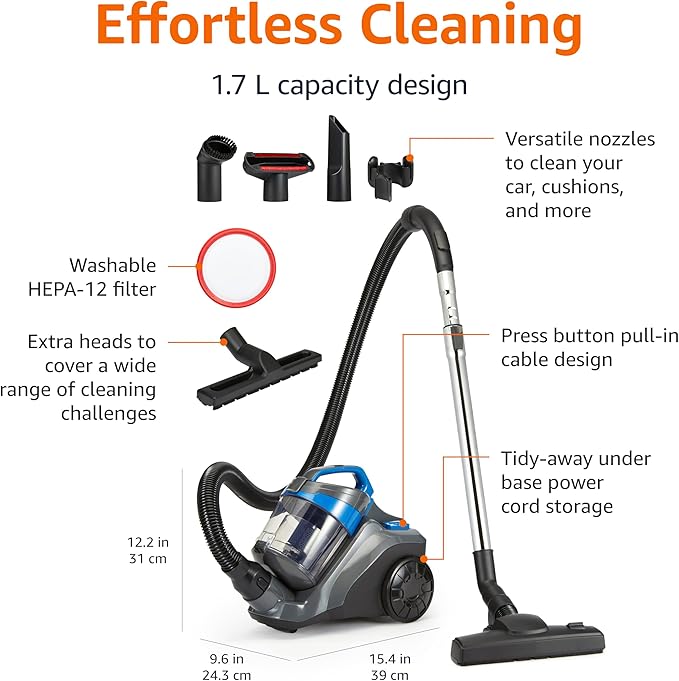 Our Amazon Basics 850W Bagless Cylinder Vacuum Cleaner combines high suction power with everyday convenience, delivering an efficient clean across both carpets and hard floors. Featuring an 850-watt motor, this vacuum ensures strong suction for deep and thorough cleaning, while the HEPA-12 filtration system captures up to 99.5% of fine dust and allergens, making it perfect for allergy sufferers. Its compact, lightweight body and 360° swivel wheels make it easy to maneuver around furniture and tight spaces, offering both power and practicality in one sleek design.