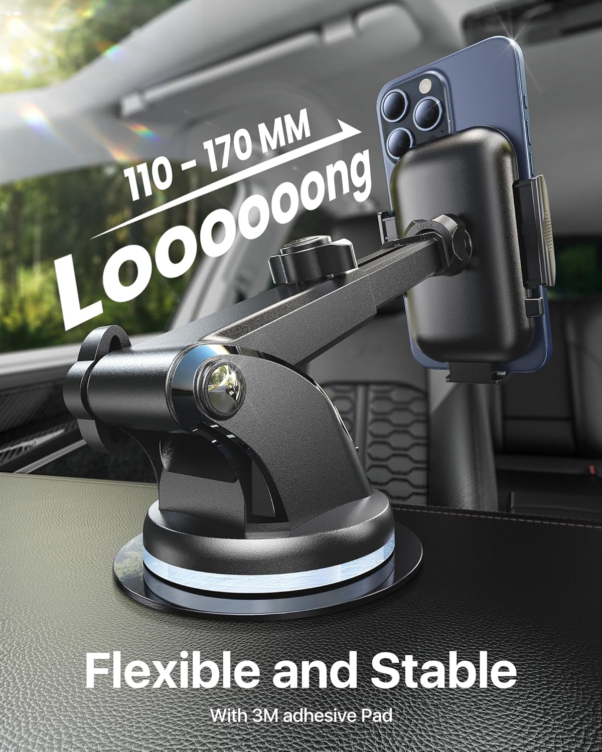 Our andobil 3-in-1 Car Phone Holder 2025 is a professional-grade, ultra-stable mounting solution designed for dashboards, windshields, and air vents. Constructed from high-quality carbon fiber materials with military-grade strength, this phone holder delivers up to 85lbs of suction power using a triple-layer nano glue system. Its 360° flexible rotation and 270° adjustable telescopic arm (5.1–7.3 inches) allow optimal horizontal or vertical viewing while driving. The precision metal clamp securely holds phones of various sizes and thicknesses, providing vibration-free stability on bumpy roads. Compatible with a wide range of devices including iPhone 7–17 series, Samsung Galaxy, Google Pixel, Xiaomi, and more, it ensures safe navigation, hands-free calls, and convenient device access. Durable, heat-resistant, and reusable, this phone holder keeps your car interior tidy and functional for years.