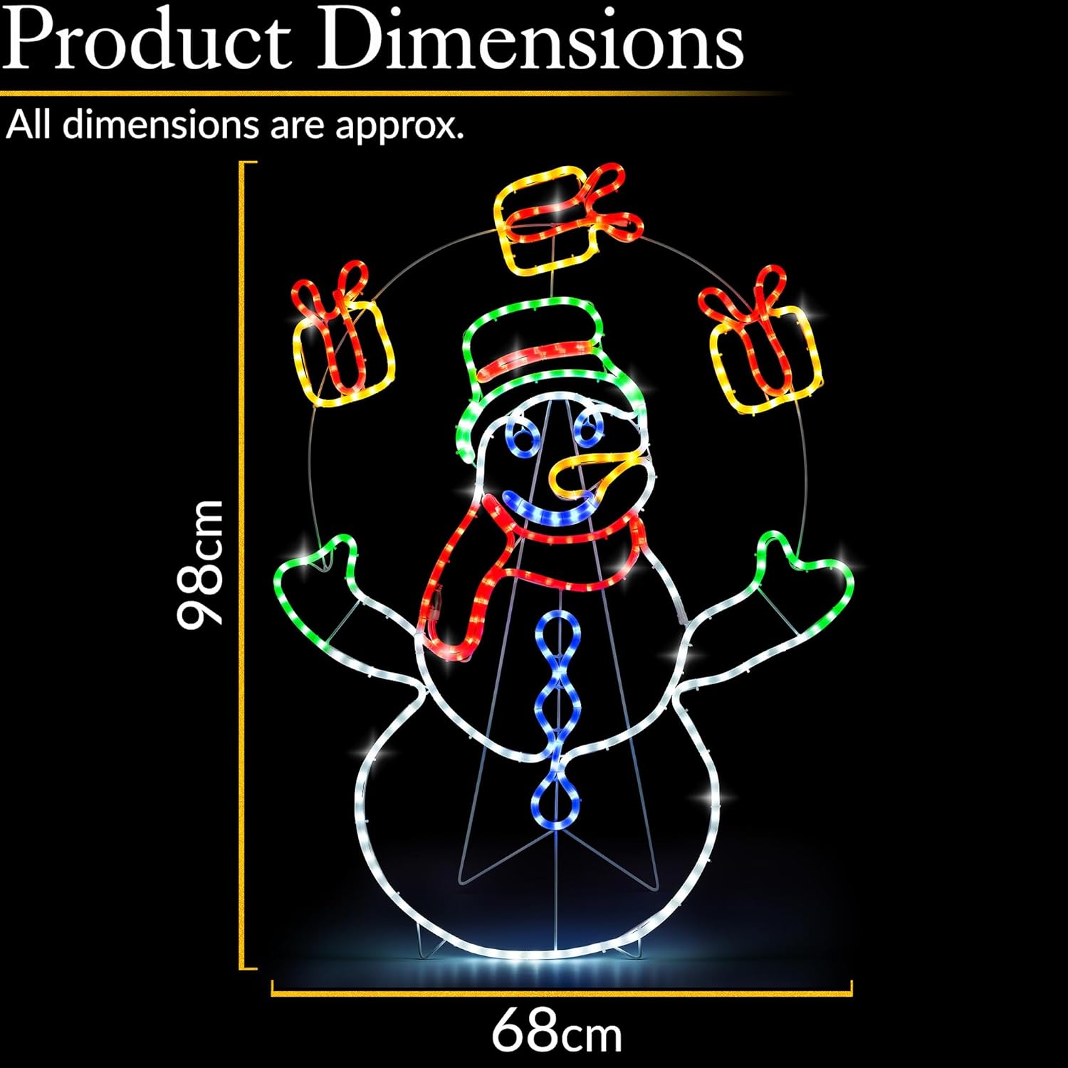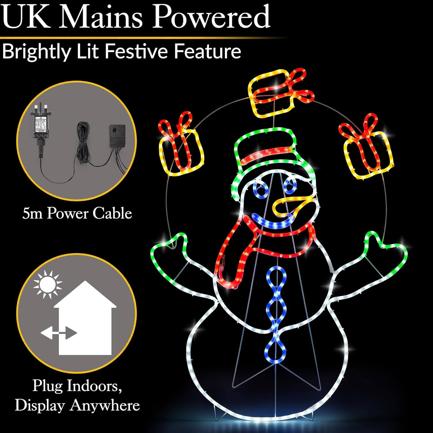 Our Animated Juggling Snowman Christmas Light brings festive cheer to your garden or home exterior. Featuring 200 multicoloured LEDs and a fun juggling animation, this 98cm tall snowman lights up each present in sequence for a delightful neon-style display. The milk-coloured rope tubing enhances brightness and creates a crisp, enchanting glow visible from a distance.