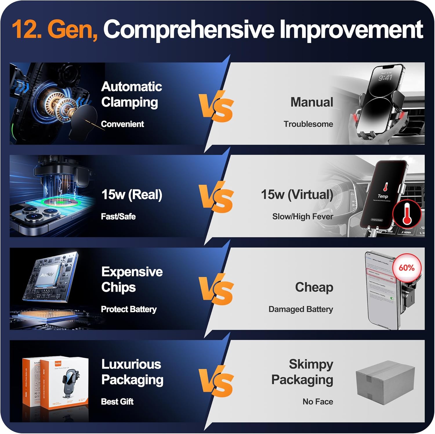 Our Auckly 15W Qi Wireless Car Charger Mount delivers fast, secure, and smart charging for modern smartphones, combining high-speed 15W wireless power with electromagnetic induction for automatic clamping. Designed with a 270° adjustable mount, it ensures effortless one-hand operation while keeping your phone stable even on rugged roads. Compatible with iPhone 11–17 series, Samsung S22–S24, and other Qi-enabled devices, this charger provides enhanced protection through intelligent temperature control, foreign object detection, and over-voltage safety. Its robust eagle-claw air vent clip ensures 200% stronger grip and long-lasting reliability, making it an excellent companion for daily driving and long trips.