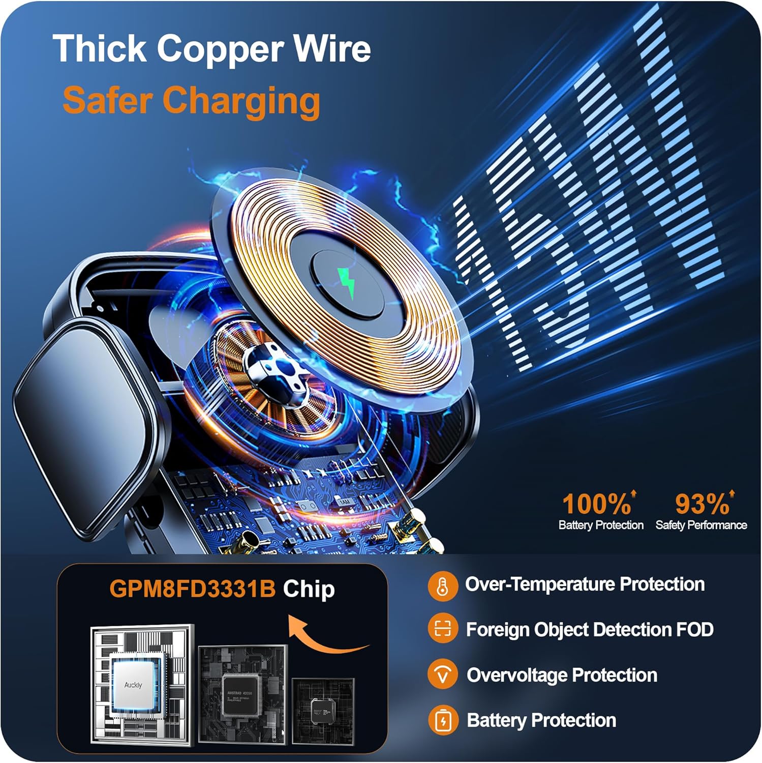 Our Auckly 15W Wireless Car Charger Mount delivers advanced charging performance and superior stability for a seamless driving experience. Compatible with iPhone 12–17 and Samsung S8–S25 series, this charger supports wireless charging for multiple devices, including Google, LG, and OPPO phones. Its intelligent electromagnetic induction enables automatic clamping and release, while the 15W fast charge powered by an AI chip ensures rapid, safe, and efficient energy delivery. Designed for 99% of cars, its reinforced “eagle-claw” clip provides 200% more stability, making it ideal for sedans, SUVs, and off-road vehicles. With its sleek build, smart protection, and 10-year durability, it’s the perfect hands-free solution for today’s drivers.