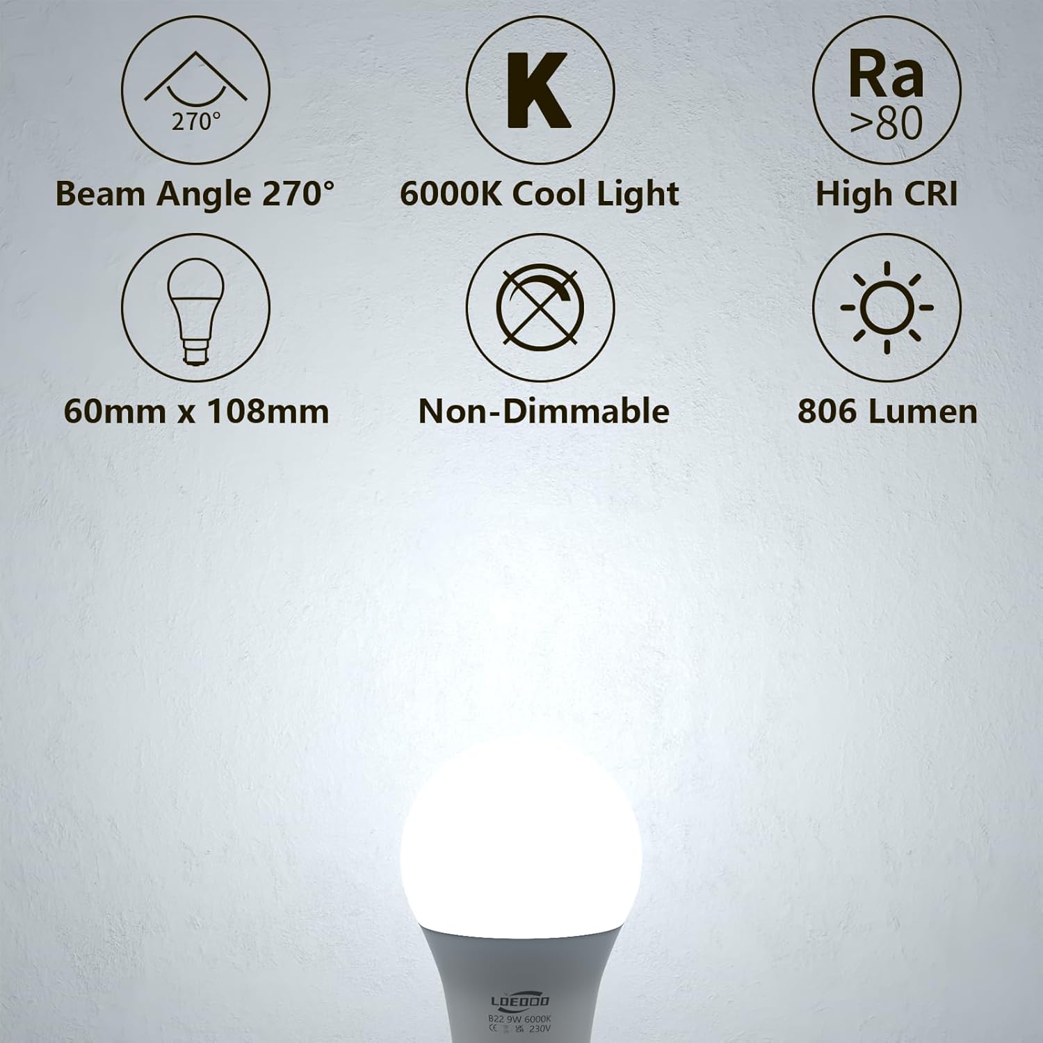 Our B22 LED bulbs deliver 9W energy-saving lighting with 806 lumens brightness, equivalent to a 60W incandescent bulb, providing 6000K cool white light that is flicker-free, noise-free, and eye-friendly, suitable for various fixtures such as chandeliers, ceiling fans, pendants, and table lamps, offering up to 25,000 hours lifespan and high CRI for comfortable illumination.