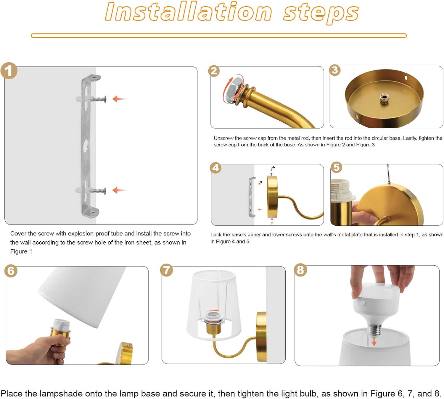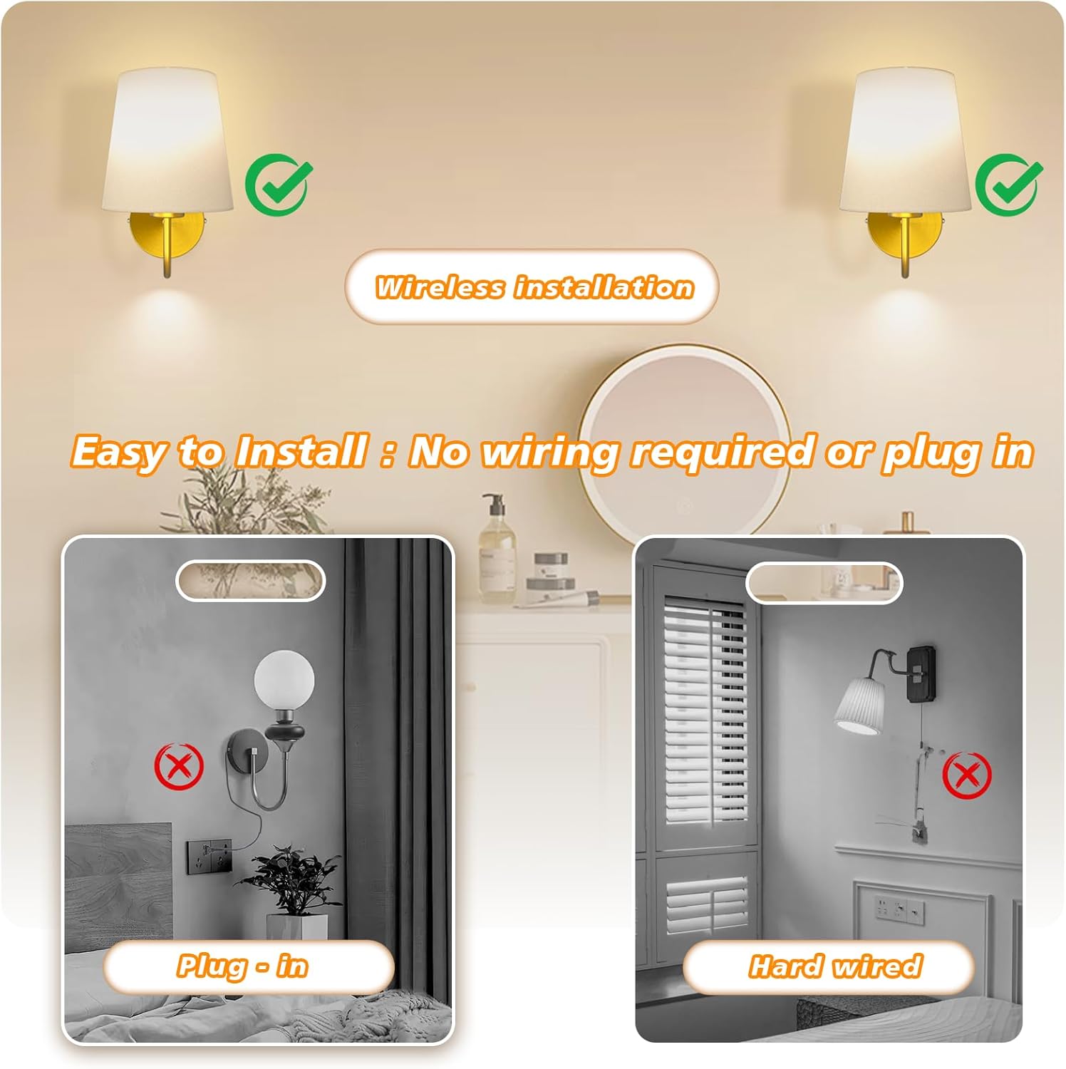 Our RGB battery-operated wall lights set of 2 offers versatile and stylish indoor illumination for bedrooms, living rooms, and various home spaces. These wireless wall sconces feature white fabric shades with high-quality construction, ensuring durability and moisture resistance. Adjustable color temperature (3000K warm white, 4500K neutral, 6000K cool white), 7 RGB colors, and four brightness levels (25%–100%) allow a fully customizable lighting experience. With a built-in timer and memory function, the lights remember your last settings, while push button and remote control provide effortless operation. Rechargeable via USB, these cordless sconces deliver 25–50 hours of continuous use on a single charge, making them perfect for everyday and emergency use.