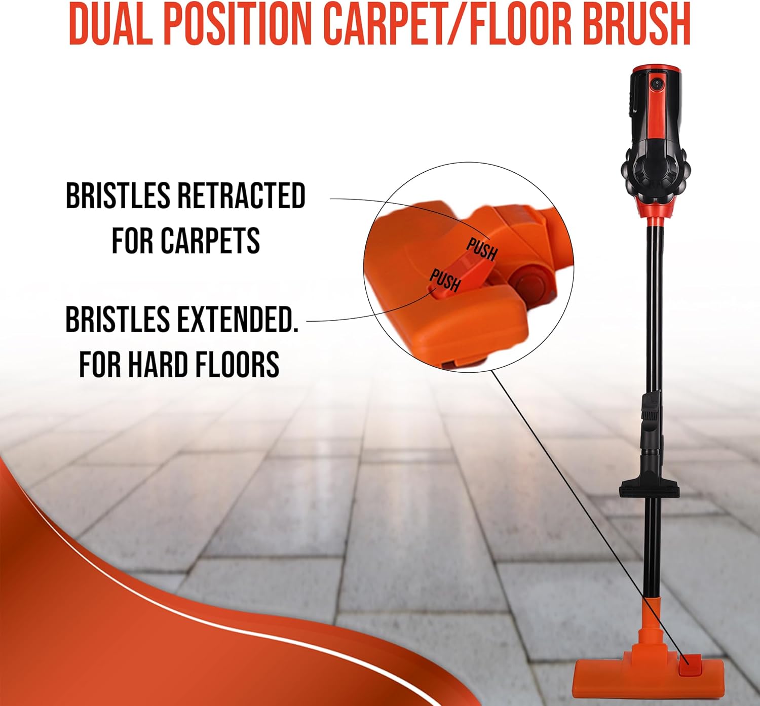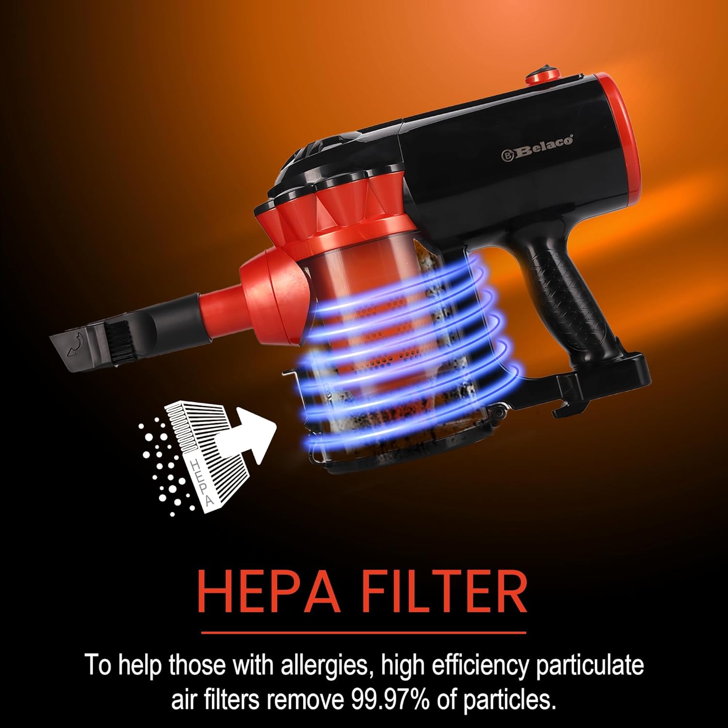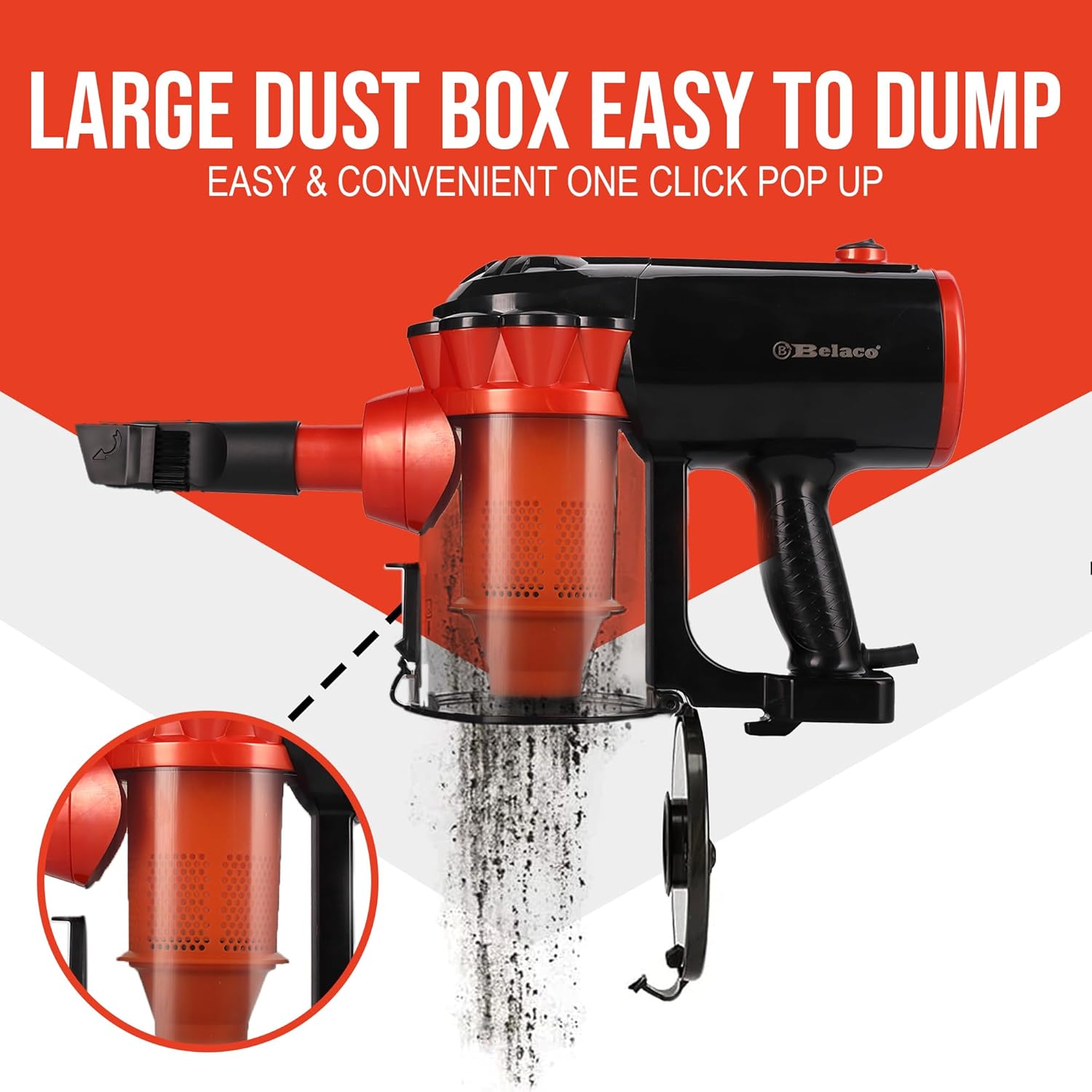 Our Belaco 3 in 1 corded upright vacuum cleaner delivers powerful 600W suction performance with a lightweight and portable design. Featuring multi-cyclonic technology and a HEPA washable filter, it ensures efficient and hygienic cleaning across all floor types. With an adjustable floor head, 5-meter cable, and easy conversion between stick and handheld modes, this bagless hoover provides versatile cleaning for hard floors, carpets, skirting boards, and ceilings without the hassle of frequent replugging.